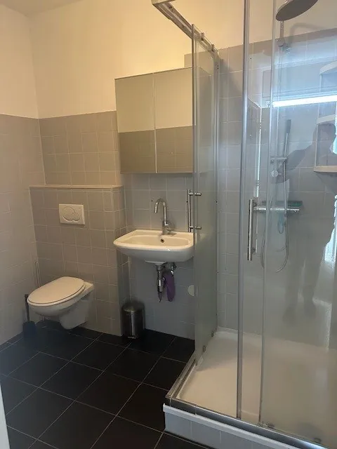 Badkamer voorzien van douchecabine, zwevend toilet, wastafel en designradiator.