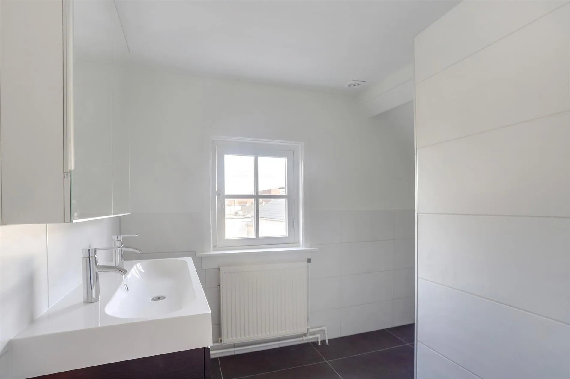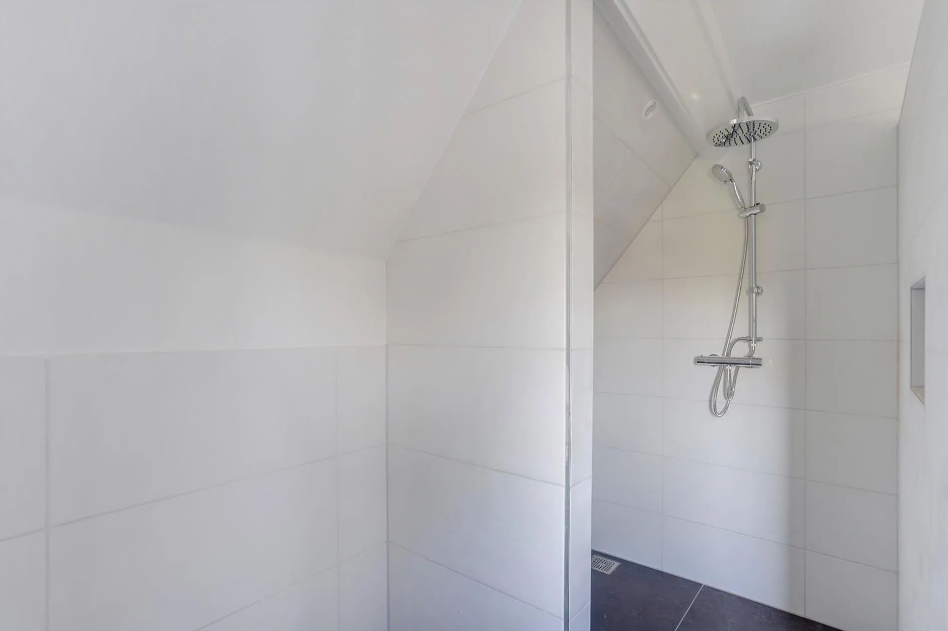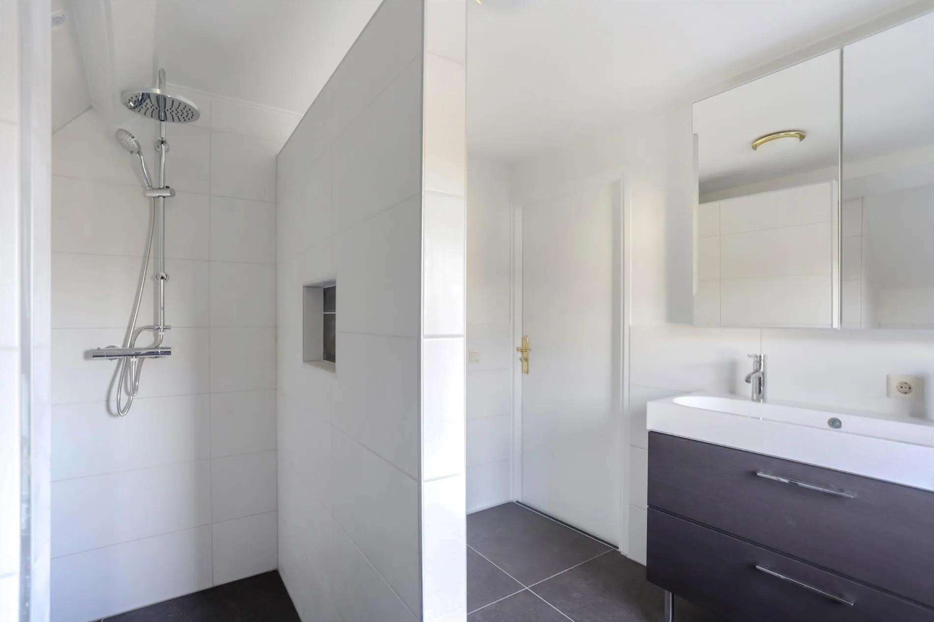 Overloop, 2 slaapkamers, nieuwe luxe badkamer voorzien van inloopdouche en wandmeubel met dubbele wastafel.