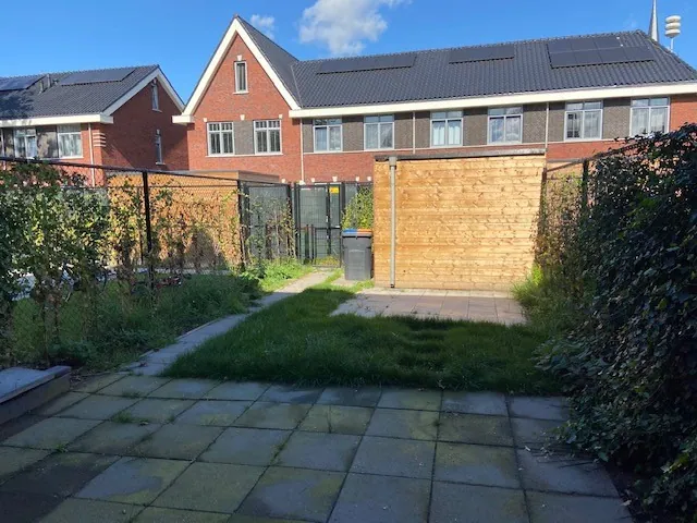 Achtertuin met houten berging en achterom.