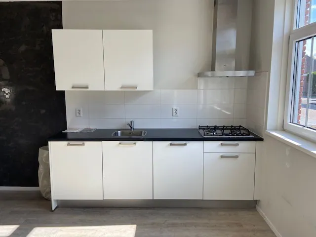 4-pits gaskookplaat, rvs-afzuigkap, koelkast en vaatwasser.