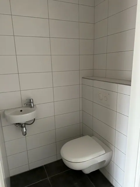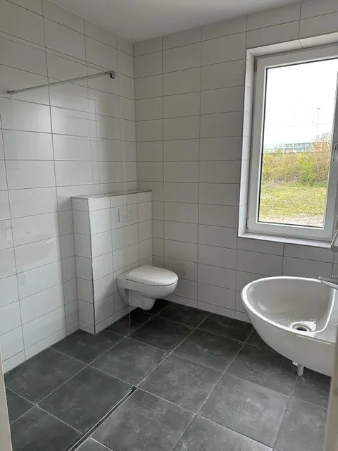 Badkamer met inloopdouche, zwevend toilet en wastafel.