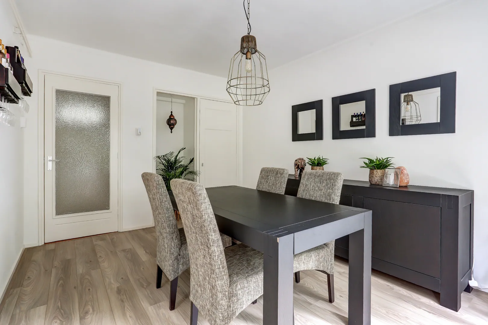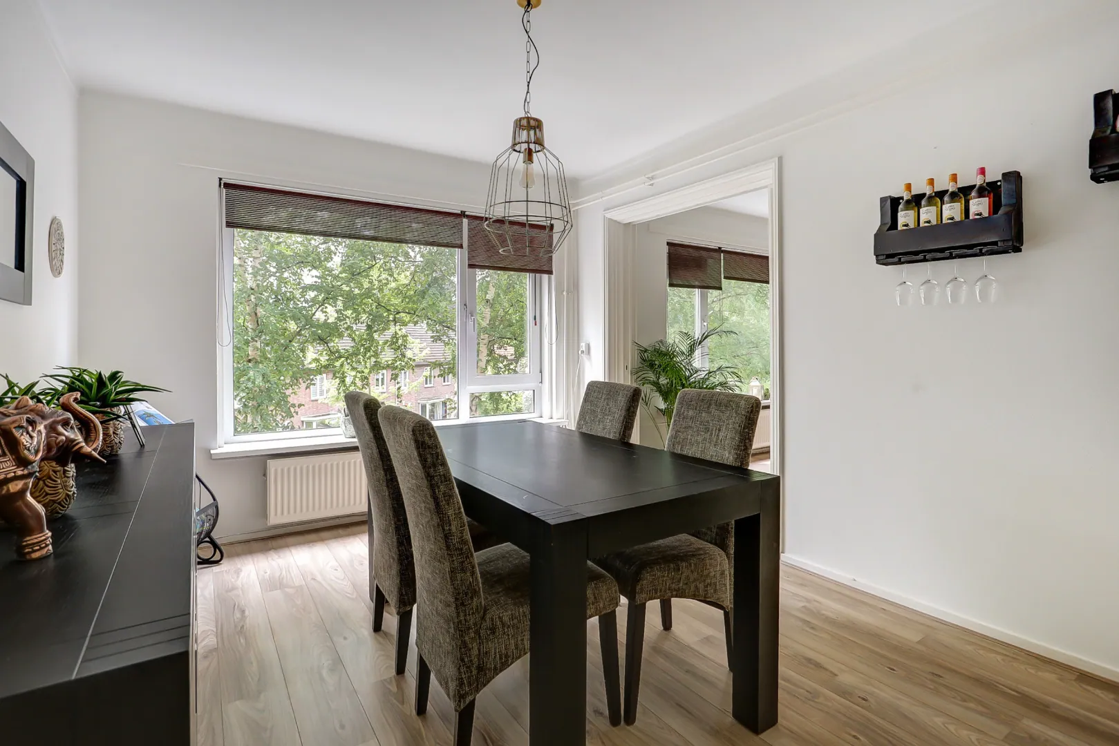 De ruim woonkamer is opgedeeld, via een open doorgang, in een zit- en eetkamer. Door de grote raampartijen is er veel lichtinval.