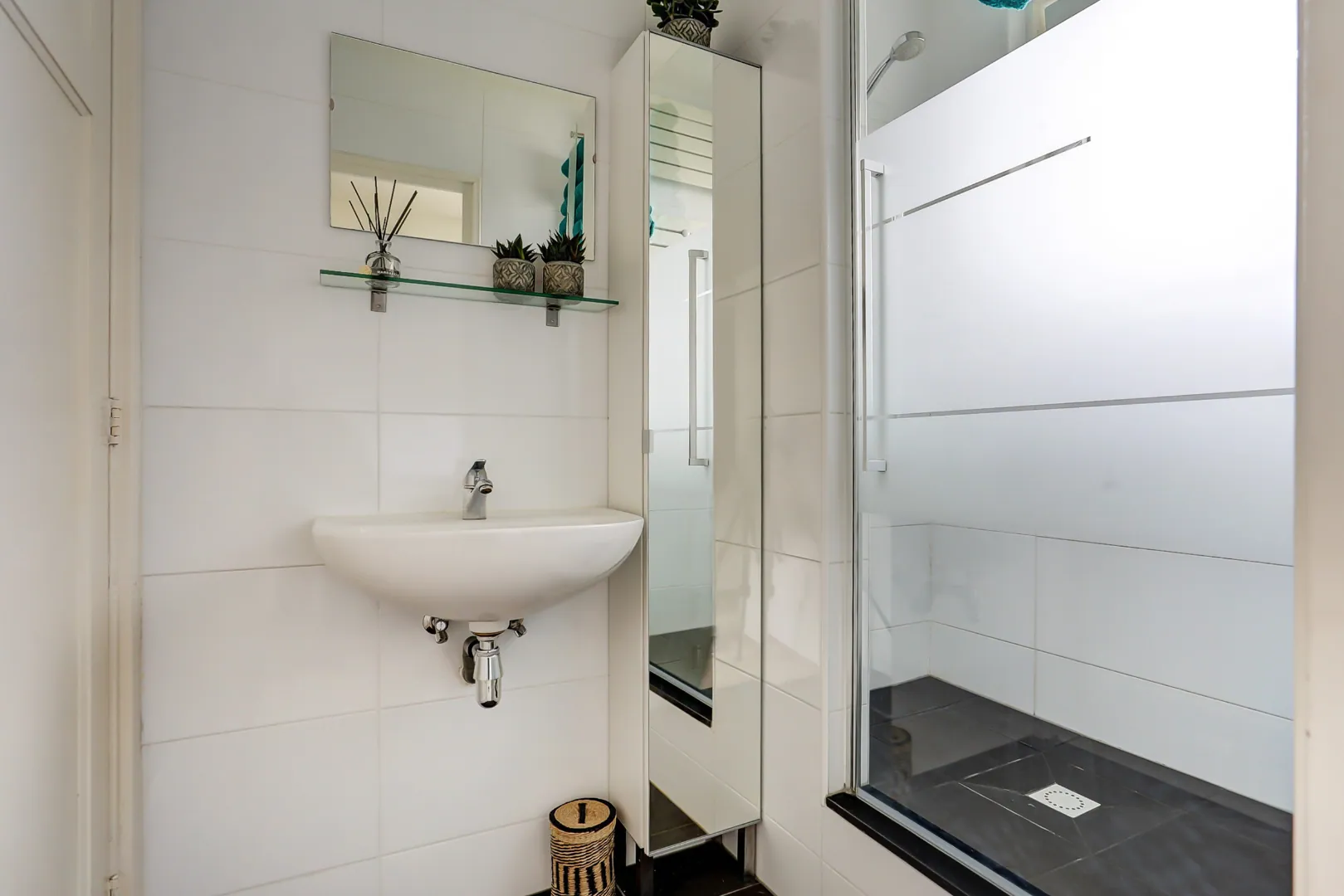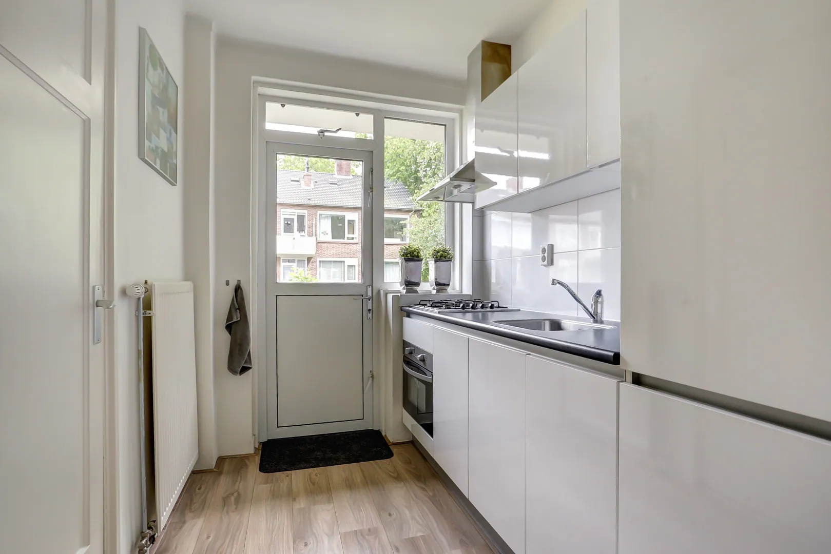 De keuken ligt aan de achterzijde van het appartement met een moderne inrichting in een rechte opstelling en bestaat o.a. uit een 4-pits gasfornuis, oven, vaatwasser en een afzuigkap. Vanuit de keuken is er toegang tot het balkon en de badkamer welke voorzien is van wederom een moderne betegeling, douche en wastafel. Vanaf het balkon is er zicht op de gezamenlijke tuin.