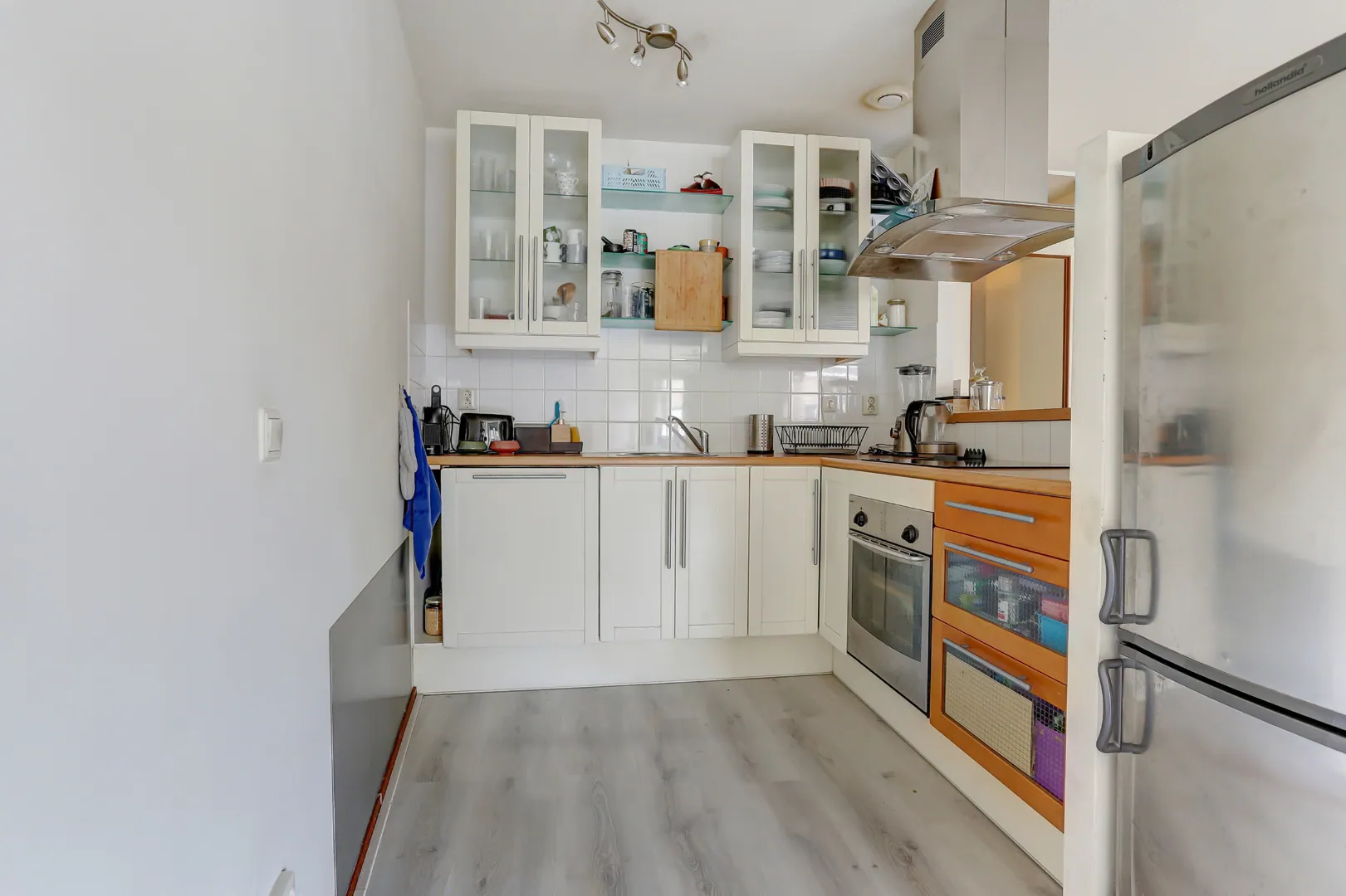 Open keuken voorzien van inductie kookplaat,rvs afzuigkap,oven,vaatwasser en losse koelkast met vriezer.