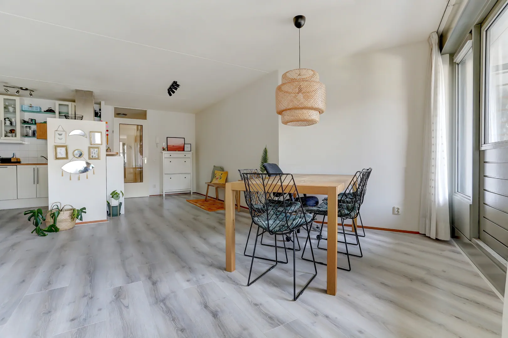 Ruime woonkamer voorzien van laminaatvloer en toegang tot het inpandige balkon.
