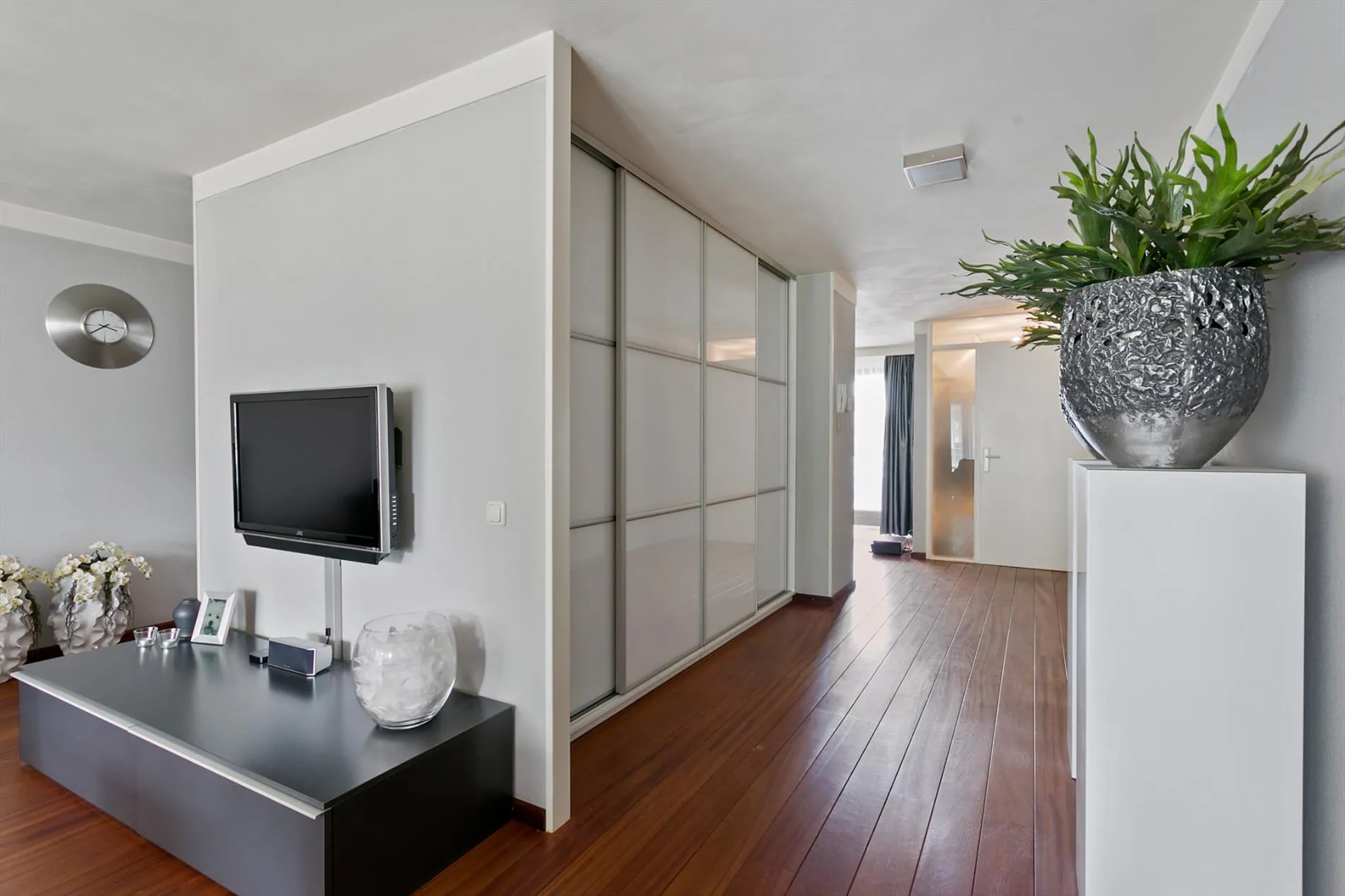 Via een tussenhal zijn de twee slaapkamers en de badkamer bereikbaar. De badkamer is voorzien van ligbad en modern dubbel wastafelmeubel. De afwerking van de slaapkamers is van hetzelfde hoogwaardige niveau als de woonkamer. Verder is er een separaat toilet en een opbergkast aanwezig.