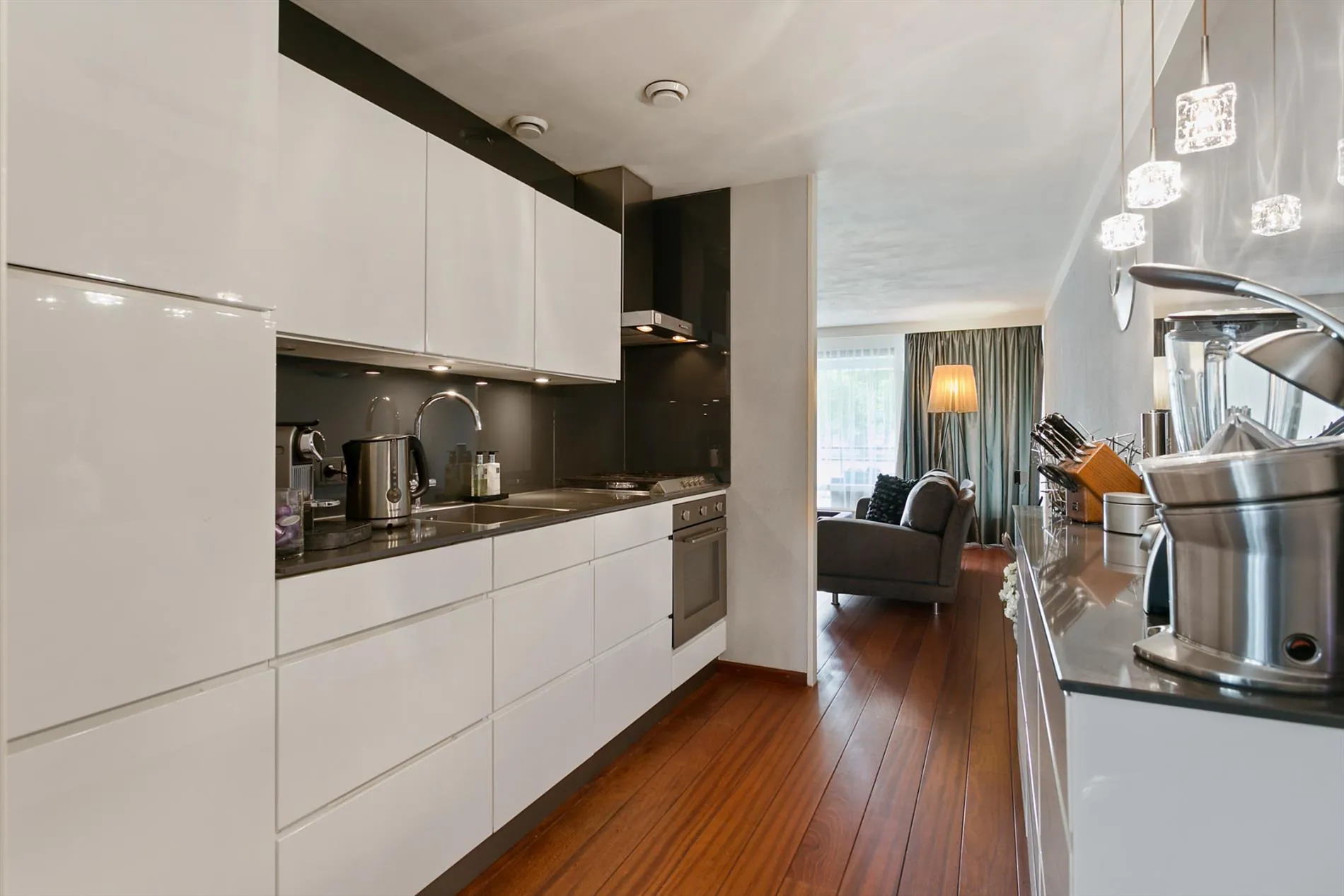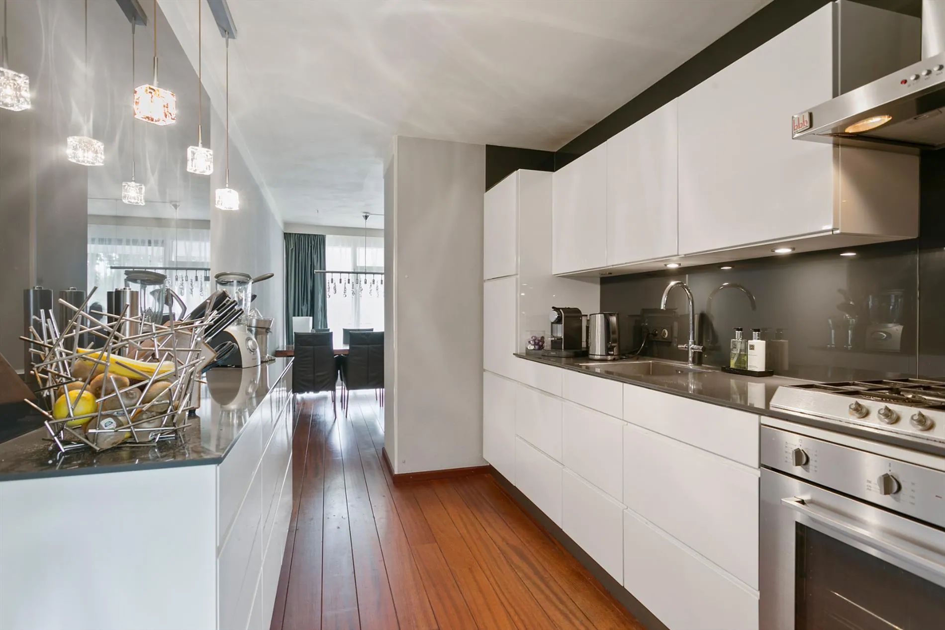 Statige entree, zeer royale woonkamer welke is opgedeeld in een eetkamer aan de voorzijde en zitkamer aan de achterzijde. Centraal tussen deze ruimten is de keuken opgesteld, voorzien van luxe afwerking en inrichting. De vloer is voorzien van een fraaie houten vloer, de wanden zijn gestuct evenals het plafond. Kortom, een hoogwaardige afwerking. Tevens centraal opgesteld, maar dan aan de andere zijde van de keuken is een chique kastenwand geplaatst.