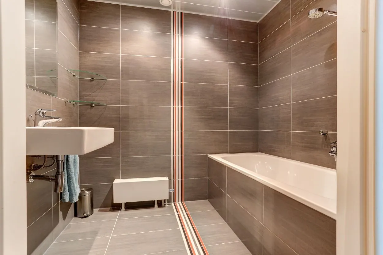Badkamer voorzien van ligbad en meubel met wastafel.