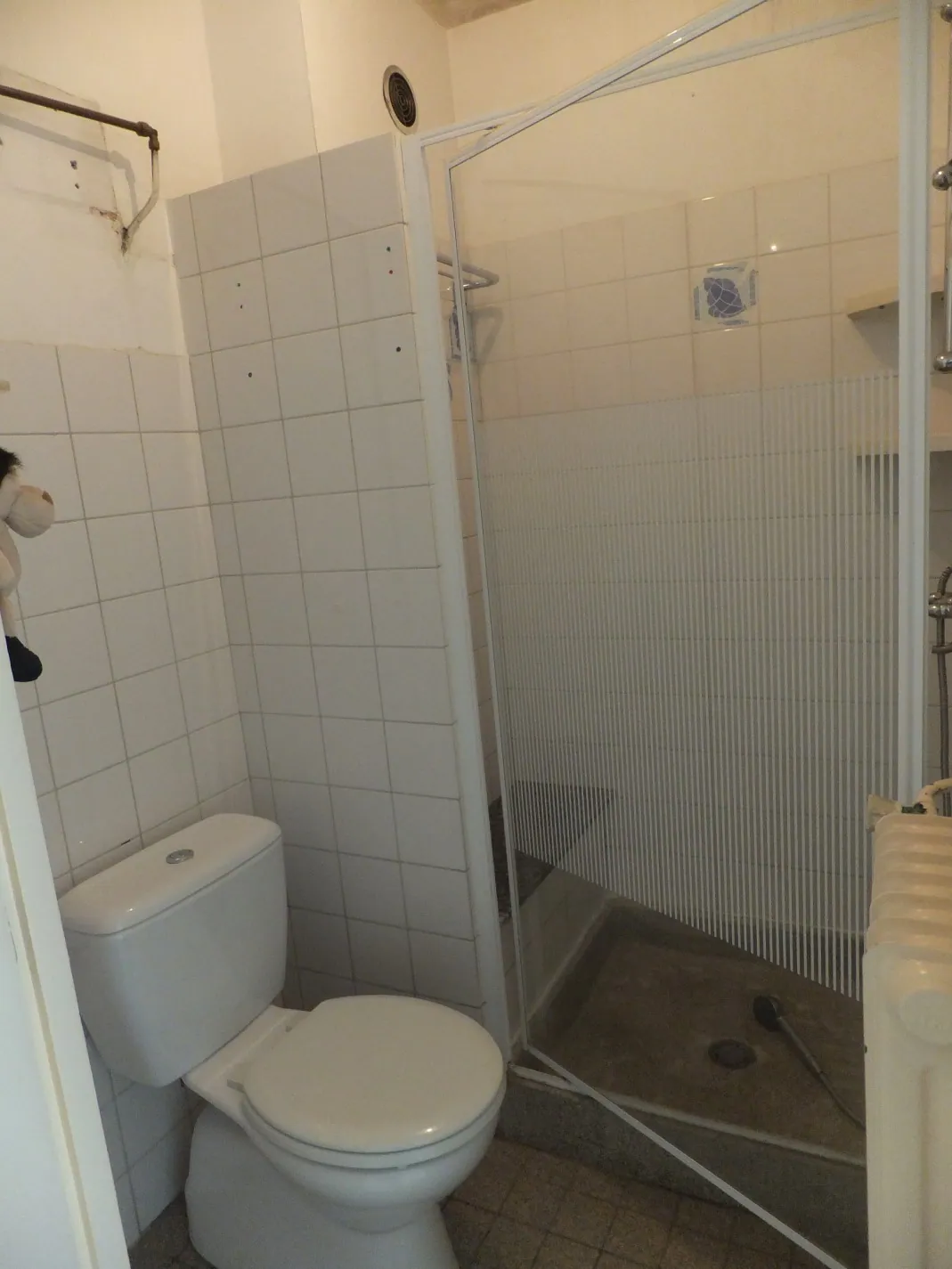 De badkamer is voorzien van een ruime douchecabine en toilet.