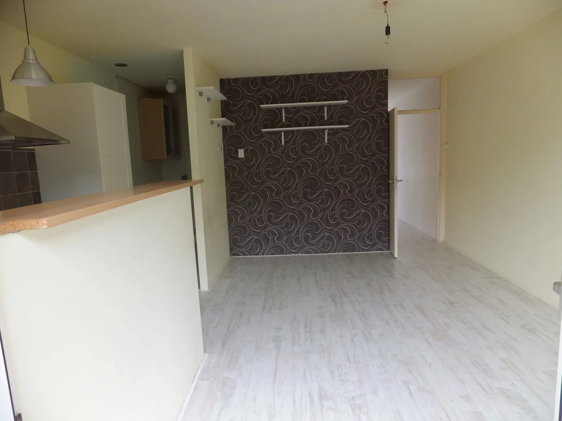 Woonkamer van circa 20 m² met aangrenzende keuken. De wanden zijn gestuct en de vloer is voorzien van een lichte laminaatvloer. De schuifpui geeft toegang tot de gezellige en knusse tuin.