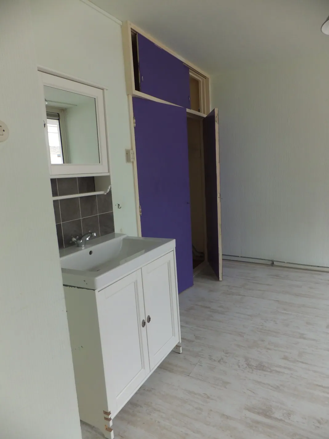 Aan de voorzijde van het appartement bevindt zich de slaapkamer van bijna 12 m². De kamer is voorzien van dezelfde lichte laminaatvloer en stucwerk wandafwerking. Tevens is er een wastafelmeubel en is er een vaste kast aanwezig.