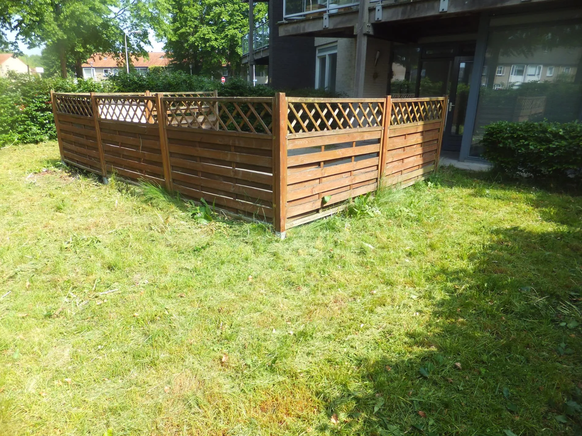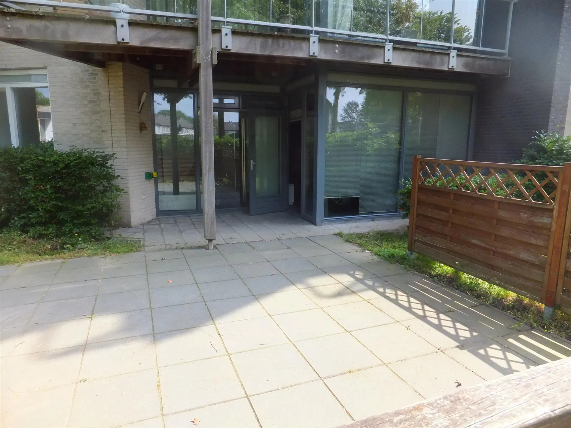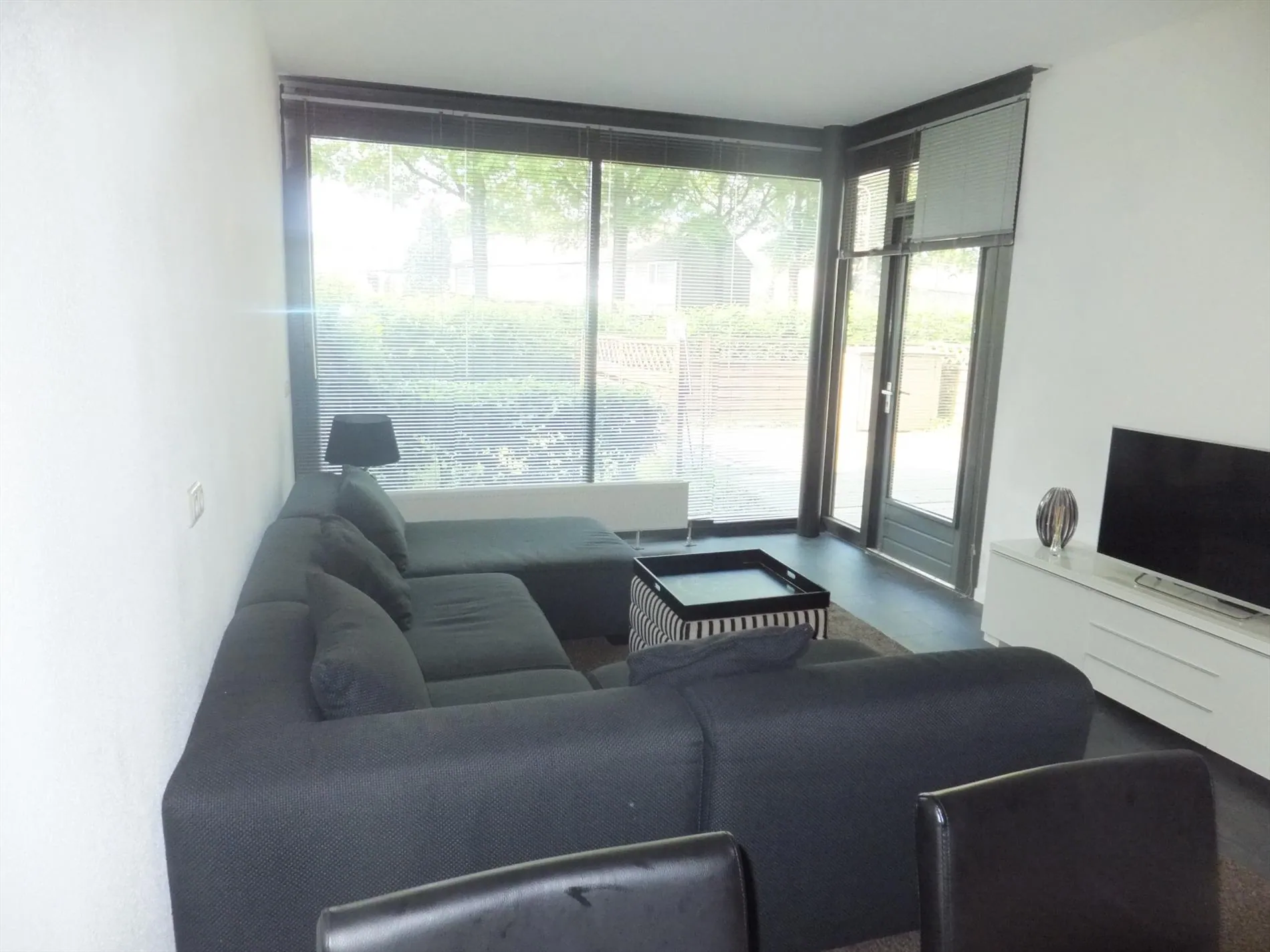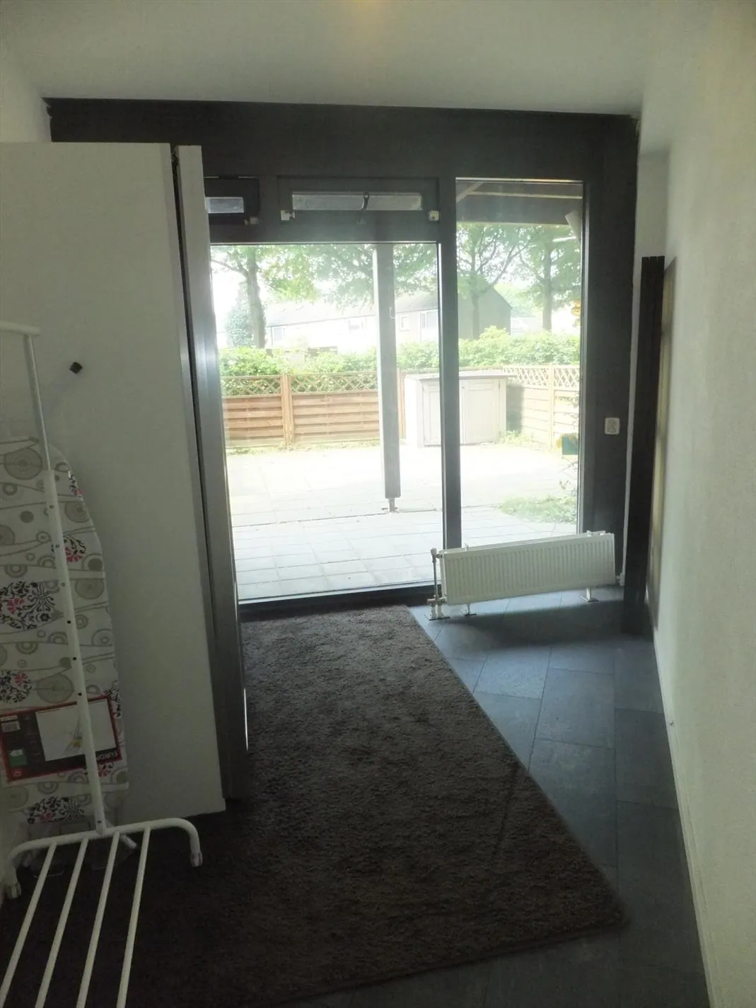 De woonkamer biedt toegang tot de tuin. Deze bestaat uit een gezellig terras en een gazon. Verder is de tuin omheind door een hekwerk.