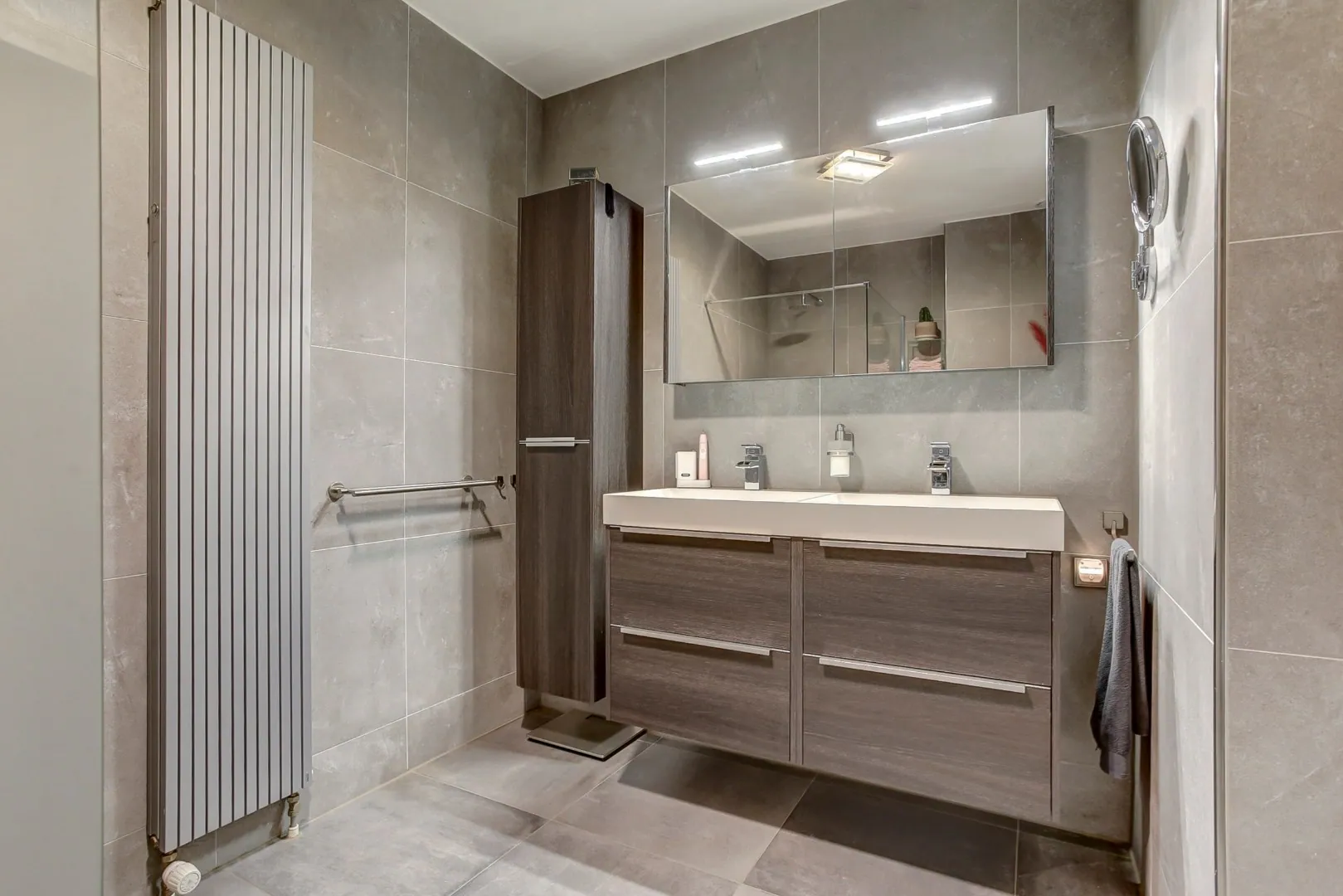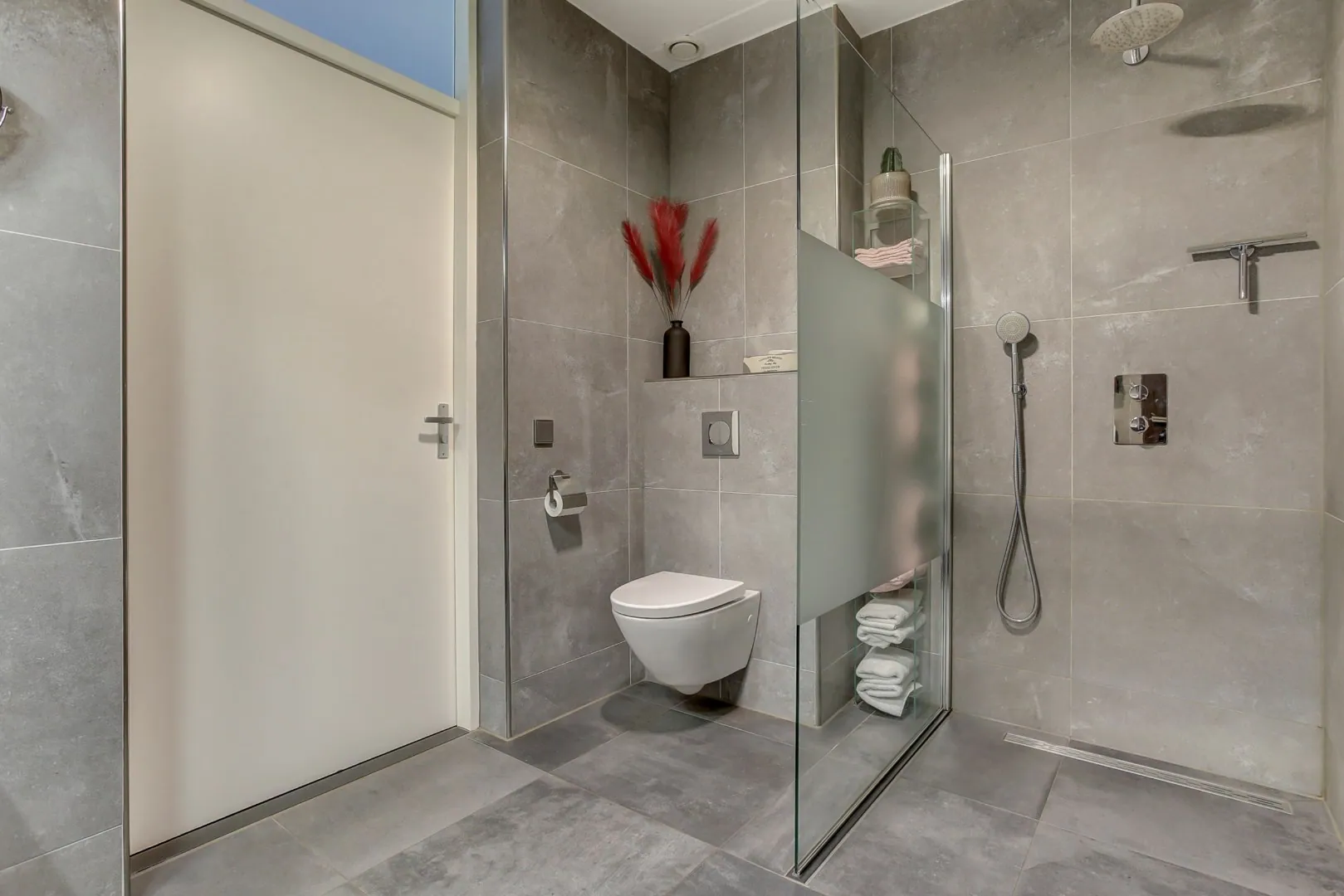 Badkamer met zwevend toilet,inloopdouche en dubbele wastafel.