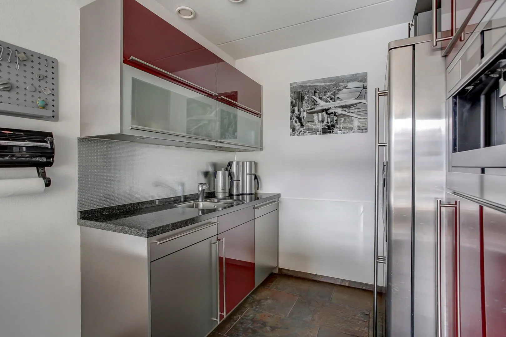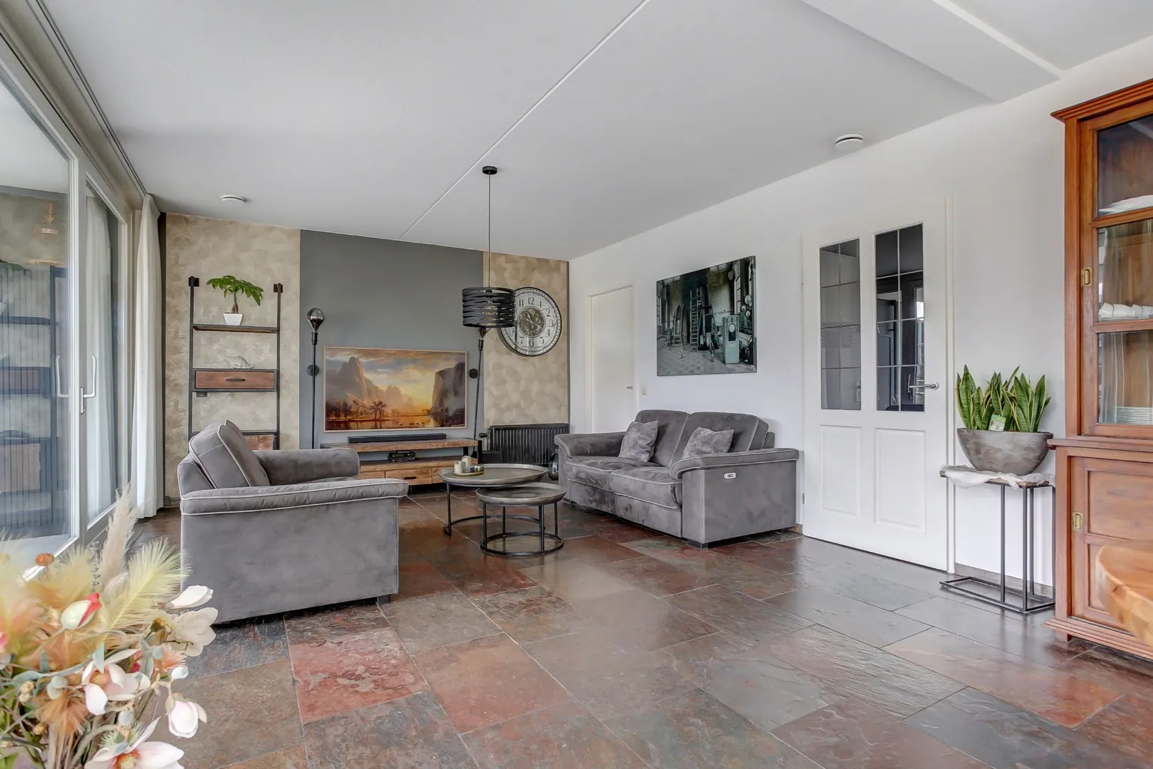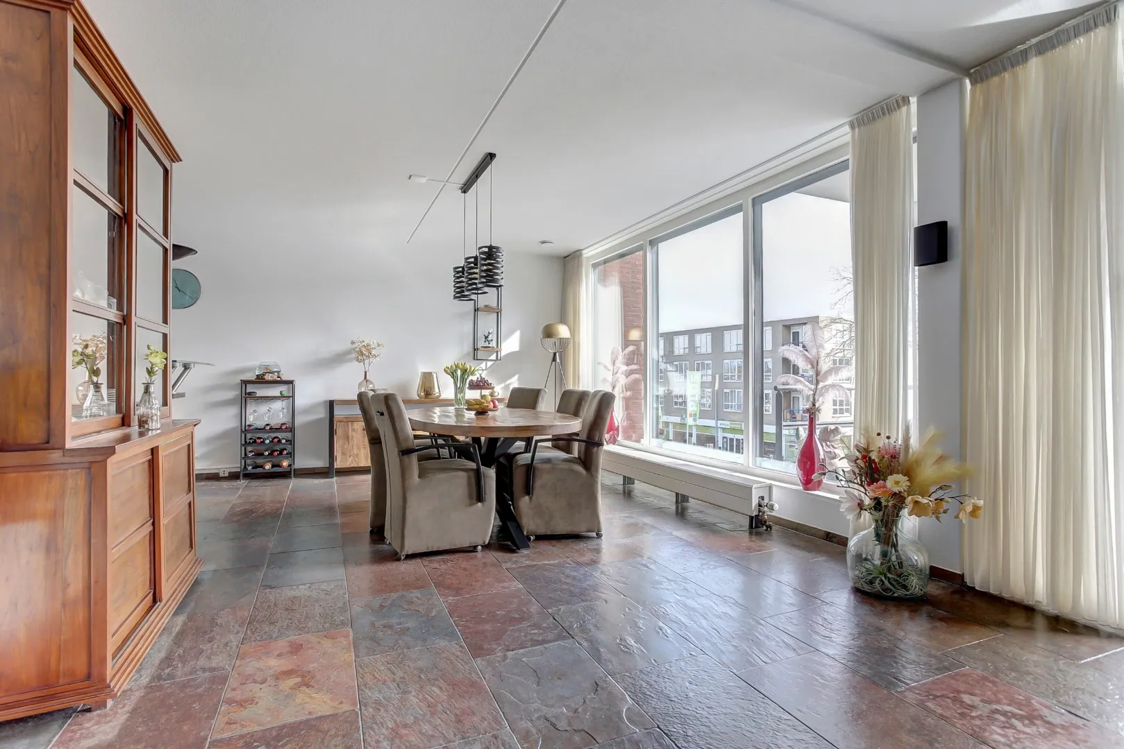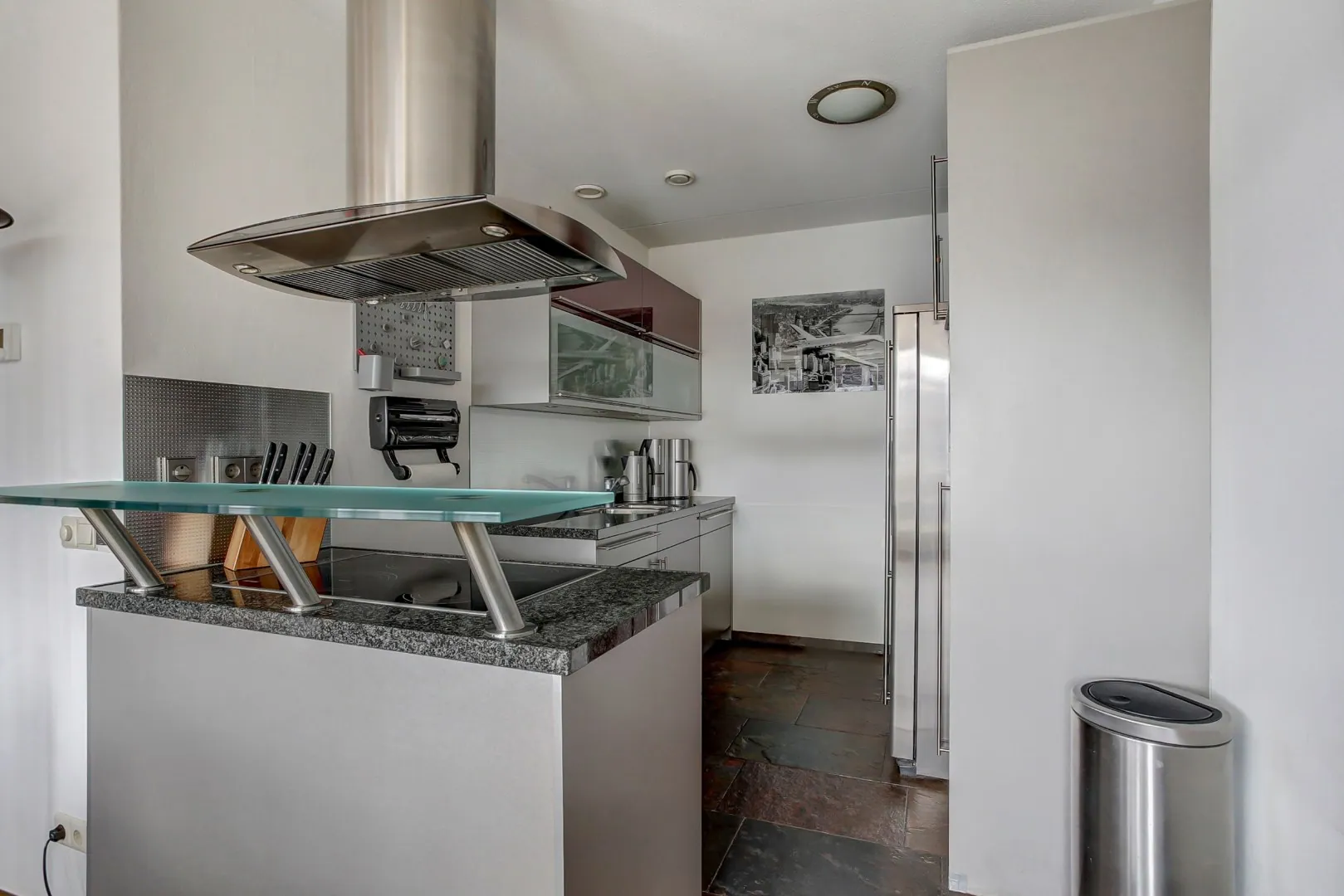 Woonkamer met open keuken welke is voorzien inbouwapparatuur zoals: kookplaat,afzuigkap,koel/vries combinatie,combimagnetron,stoomoven en vaatwasser.