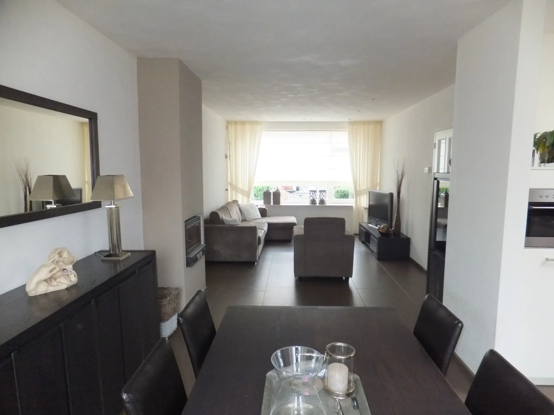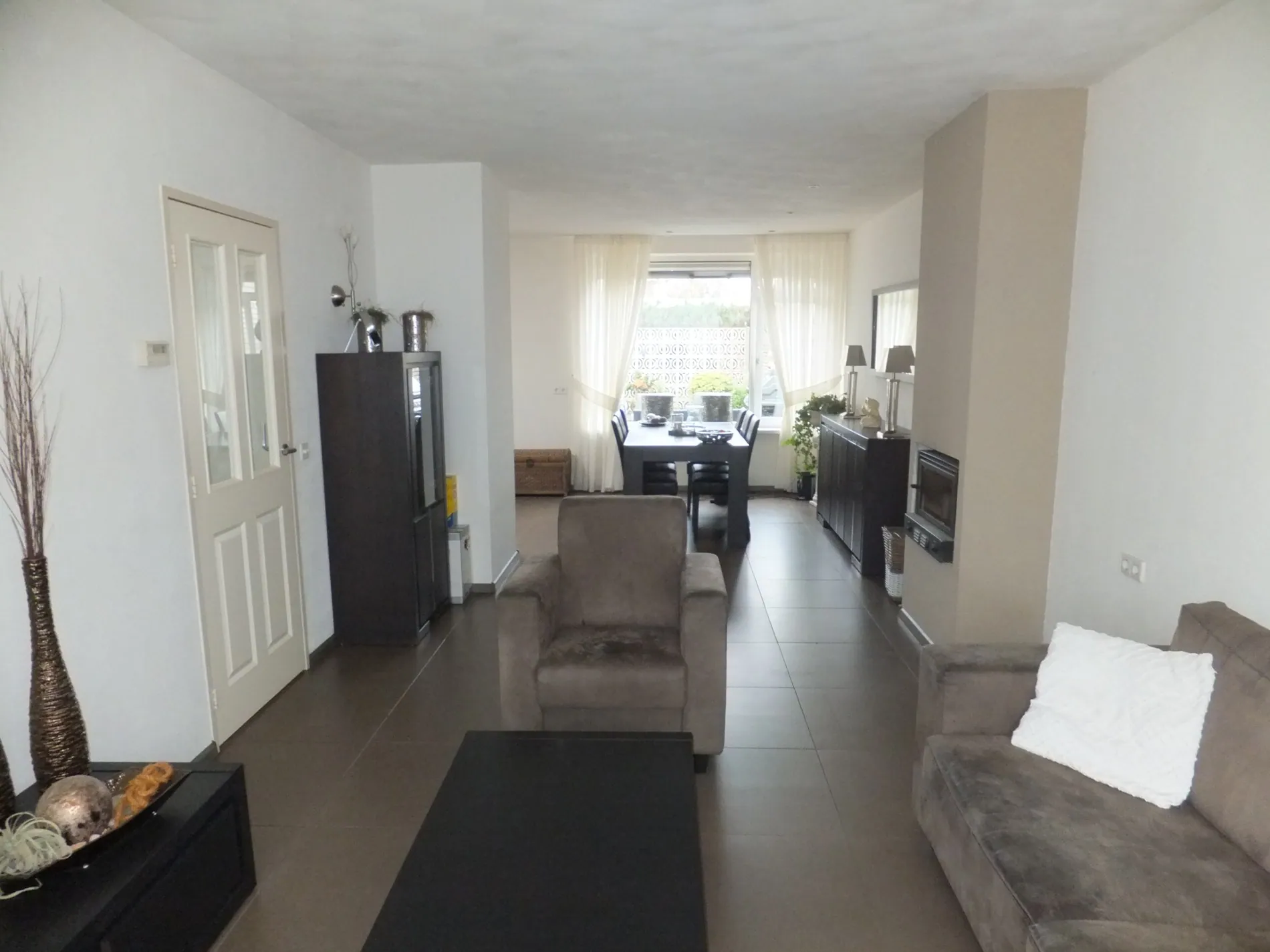 Entree, ruime hal met meterkast, linksaf naar het toilet, de badkamer die voorzien is van wastafel en douche en een slaapkamer. Tevens via de hal te bereiken 2 slaapkamers en toegang naar de woonkamer. Ruime, lichte woonkamer van ca. 35 m² met inbouw houtkachel en open keuken voorzien van koelkast, vriezer, combi-oven, combi-magnetron, 1 ½ spoelbak, vaatwasser, 5-pits gaskookplaat en afzuigkap. Bijkeuken met C.V.-ketel (HR Nefit Ecomline), wasmachineaansluiting en unit voor de vloerverwarming.