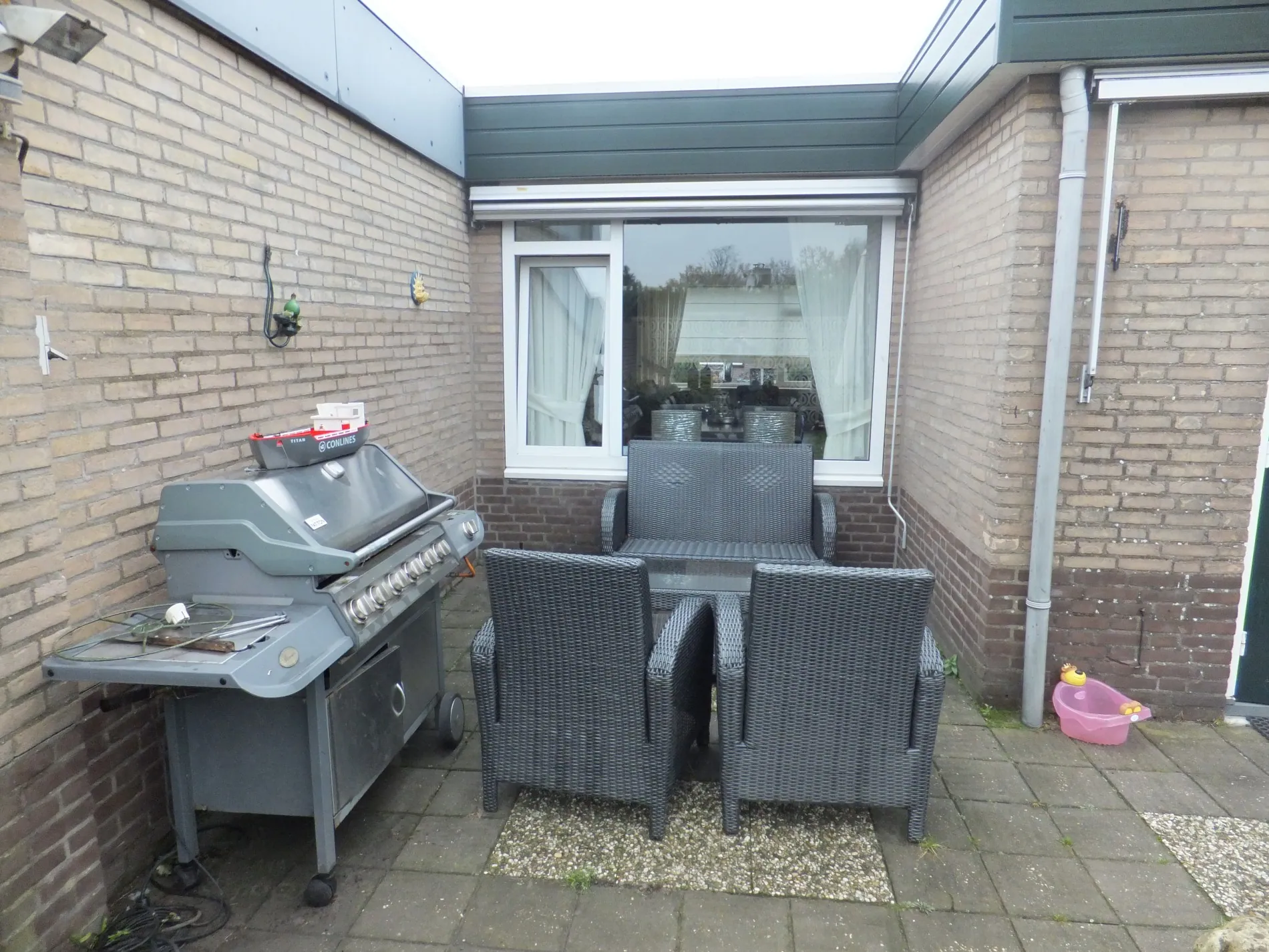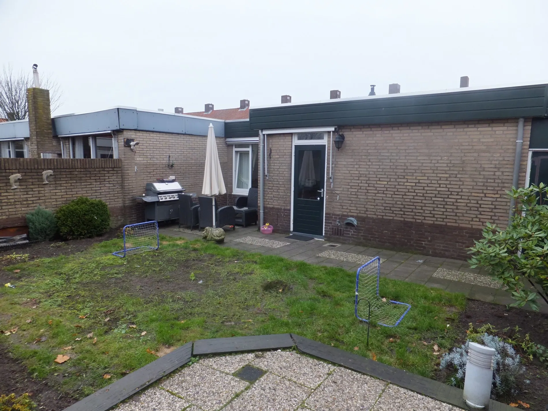 Ruime tuin op het zuidwesten met terras en achterom.