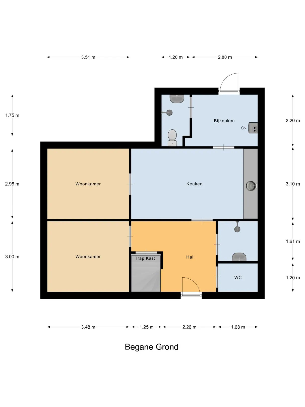 Hal, toilet, badkamer, woonkamer (thans in 2 kamers verdeeld), keuken, bijkeuken, badkamer.