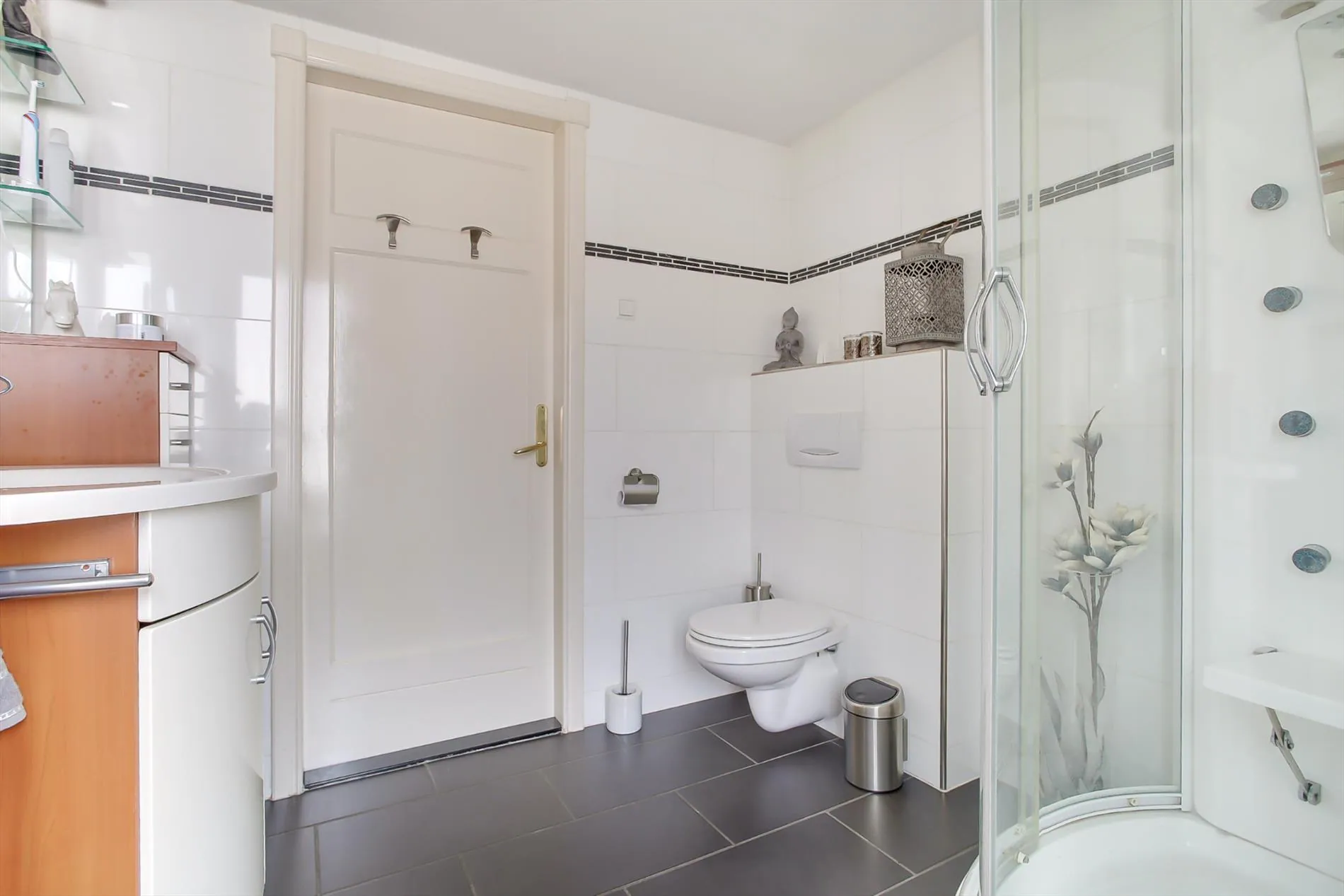 Overloop, twee grote slaapkamers en een kleine badkamer en een luxe grote badkamer.