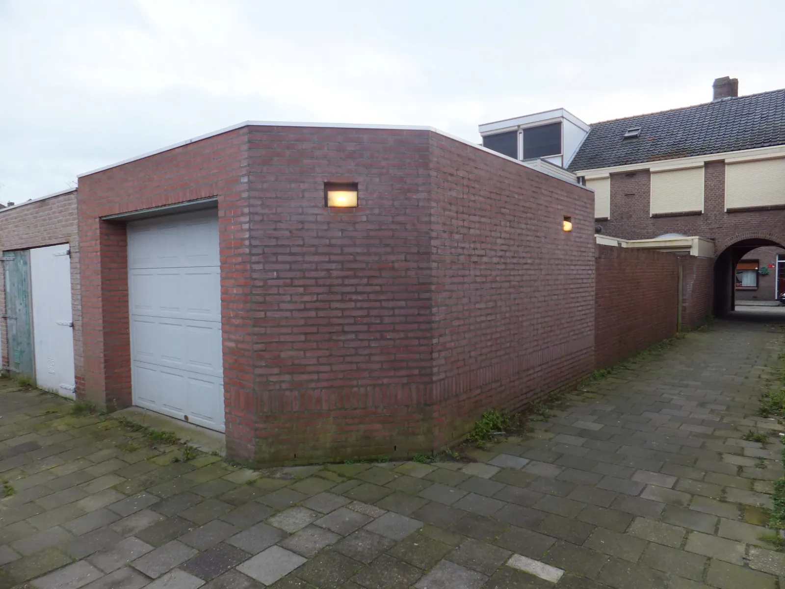 Nabij het centrum gelegen tussenwoning met garage en deels overbouwde poort.