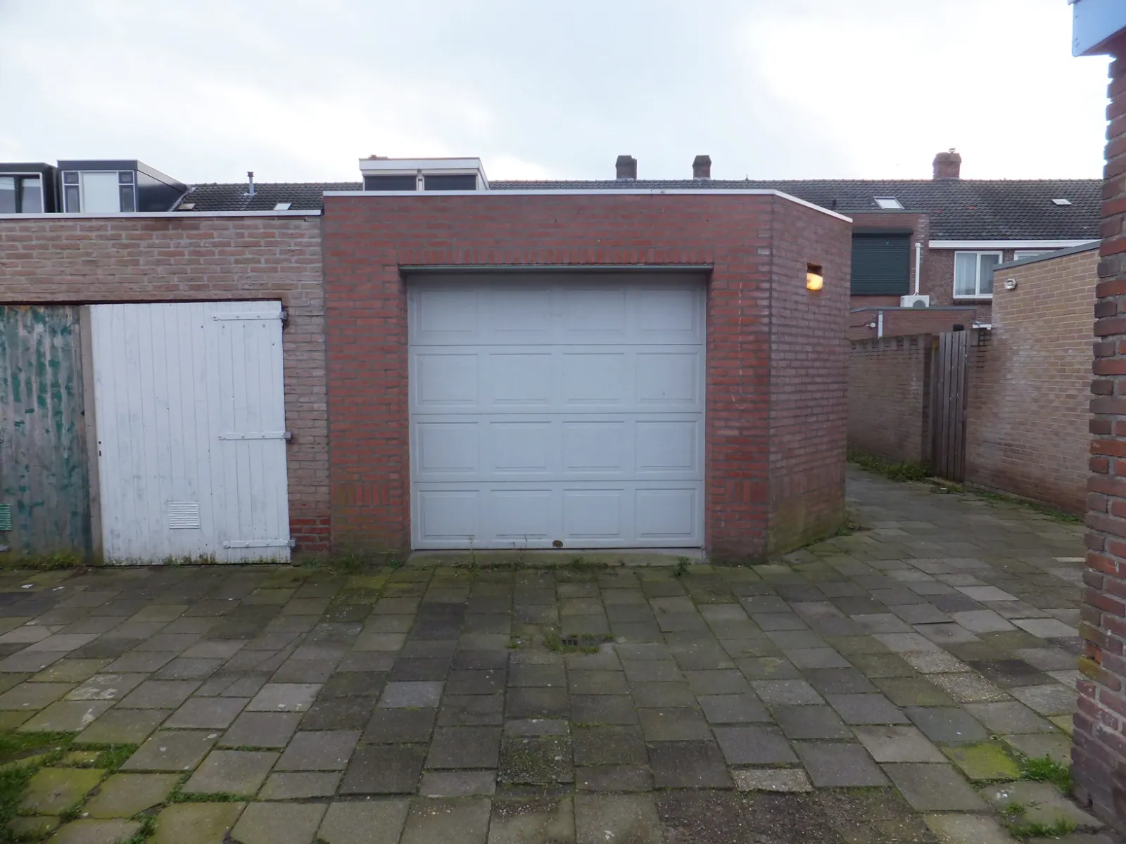 De achtertuin is betegeld met sierbestrating en geeft toegang naar de garage.