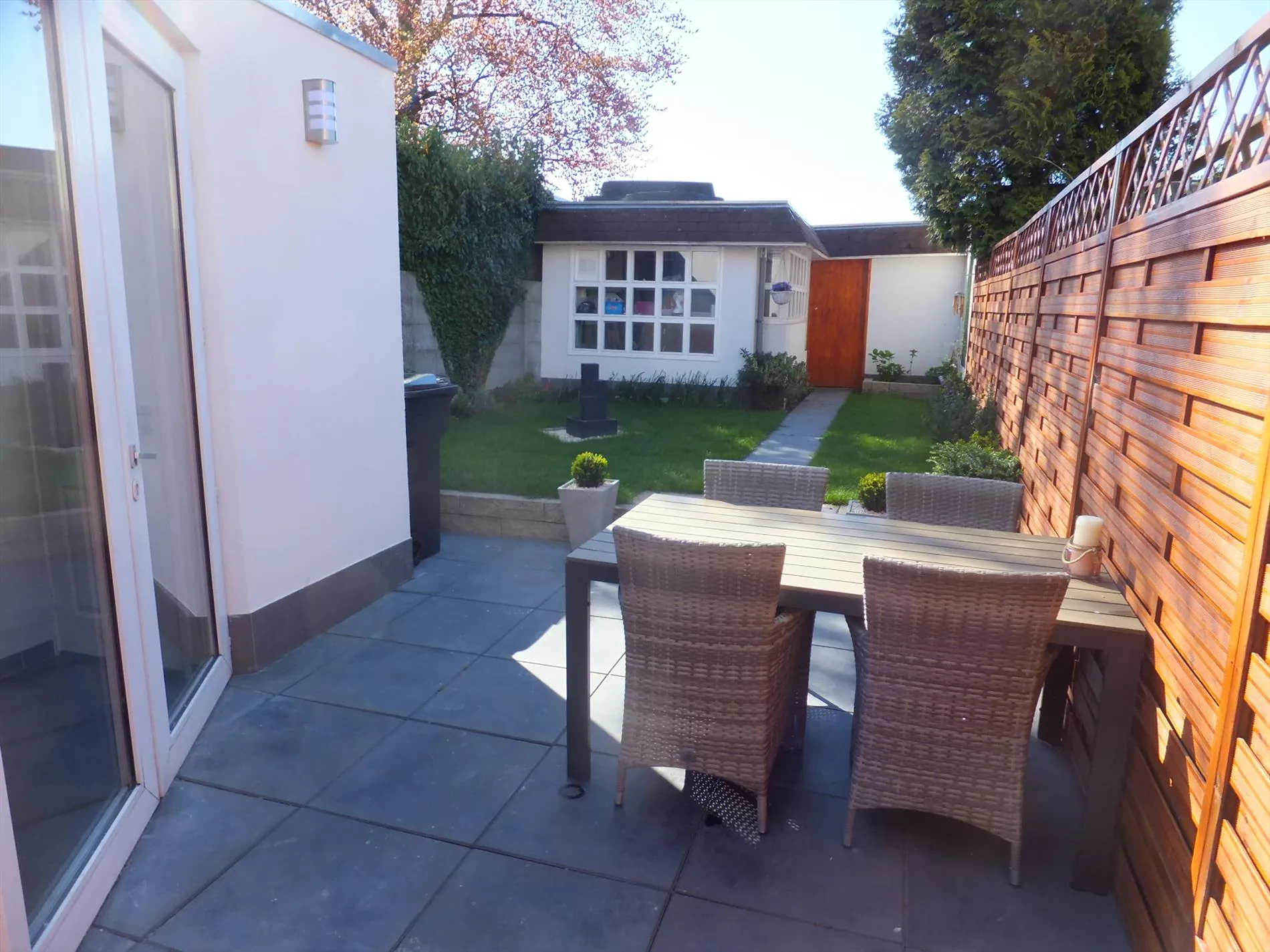 Mooi aangelegde diepe achtertuin, met toegang tot de garage.