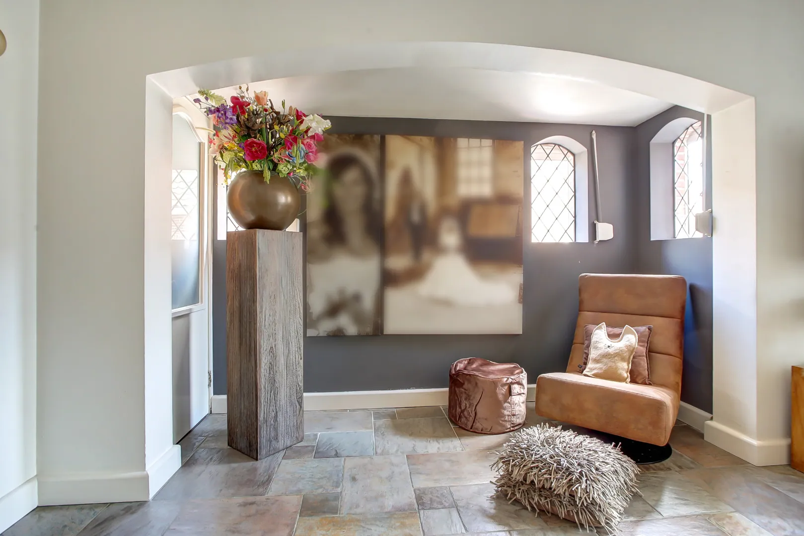 Aan een brede straat op zeer mooie locatie gelegen goed onderhouden ruime hoekwoning met voortuin, erker en eigen praktijkruimte van ca. 28 m2 voorzien van toilet, douche en keuken.