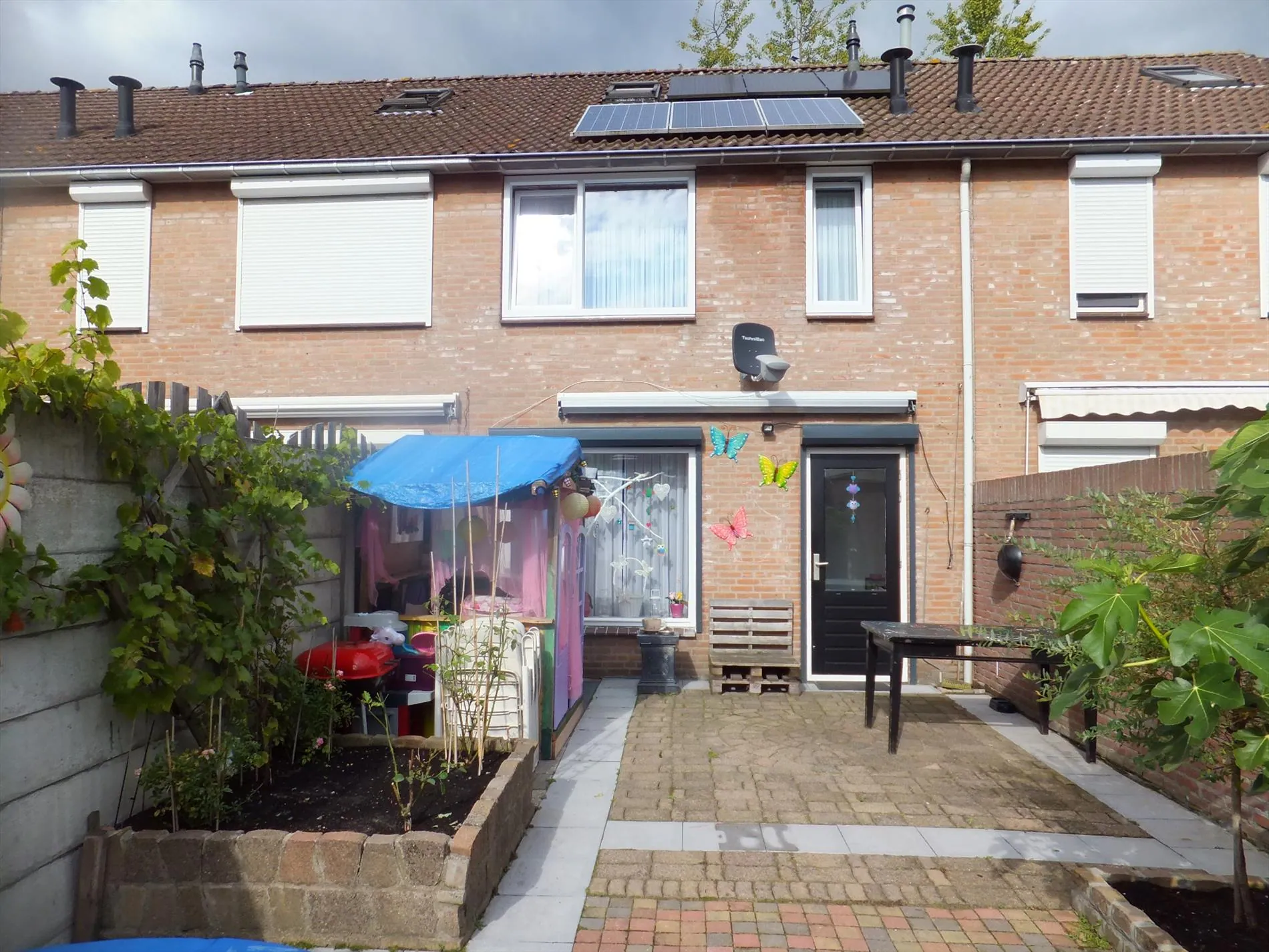 Diepe achtertuin van bijna 12 m! pal op het zuiden gelegen en voorzien van sierbestrating en stenen berging met achterom.