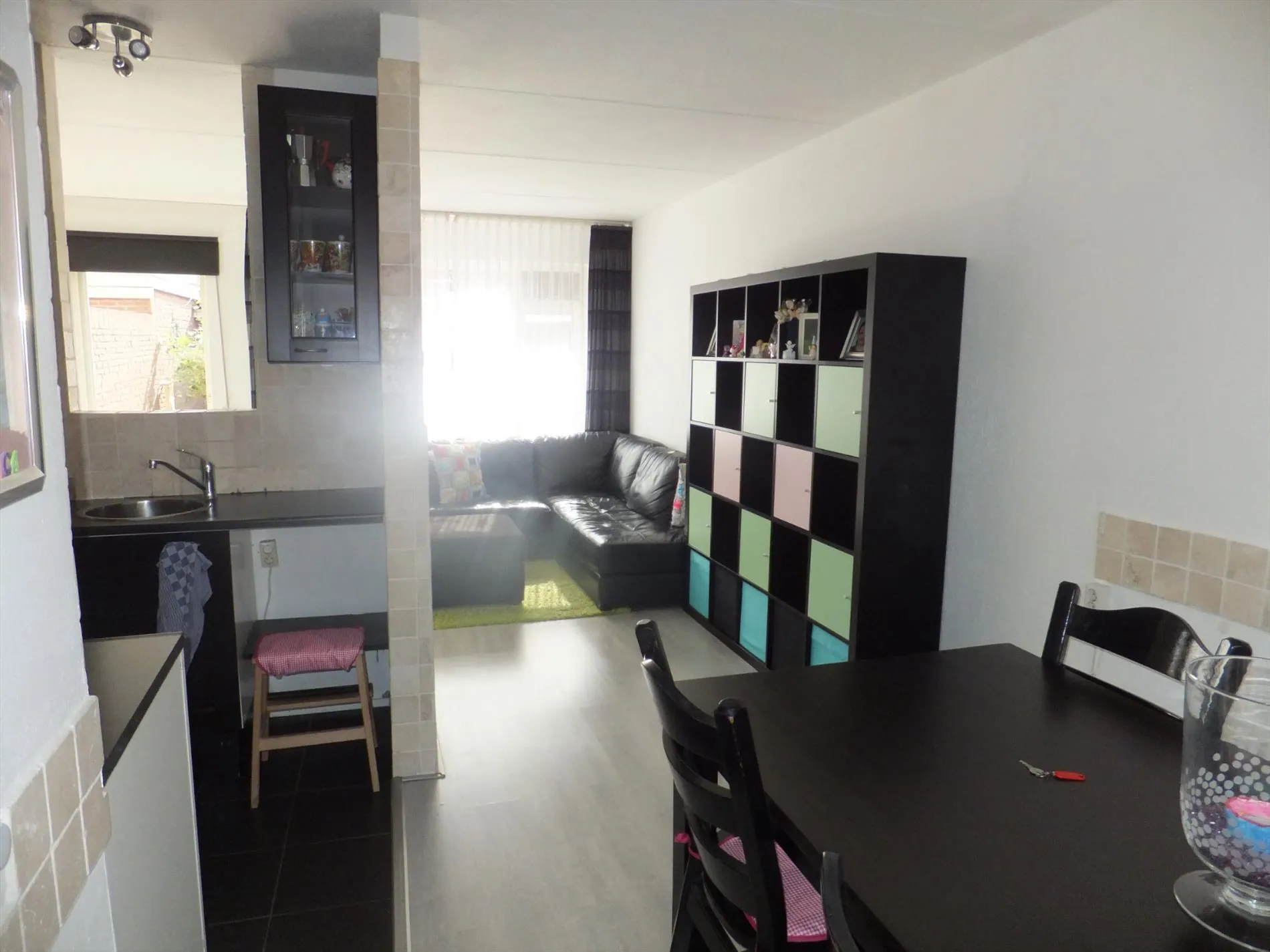 Lichte hal, aanwezigheid van de betegelde toiletruimte en trap, woonkamer welke is opgedeeld in een eetkamer aan de voorzijde en zitkamer aan de achterzijde. De woonkamer is voorzien van bergkast en lichte laminaatvloer. Verder is er een open keuken met o.a. 5-pitsgaskookplaat, afzuigkap en wasbak en er is tevens ruimte voor een vaatwasser.