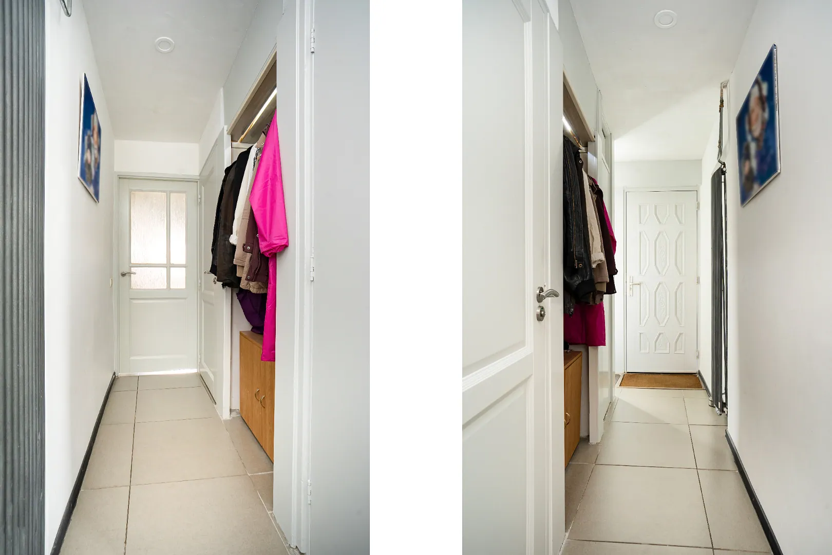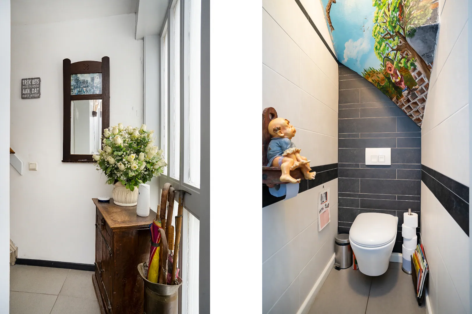 Hal met entree voorzien van tegelvloer en toilet met zwevend closet.