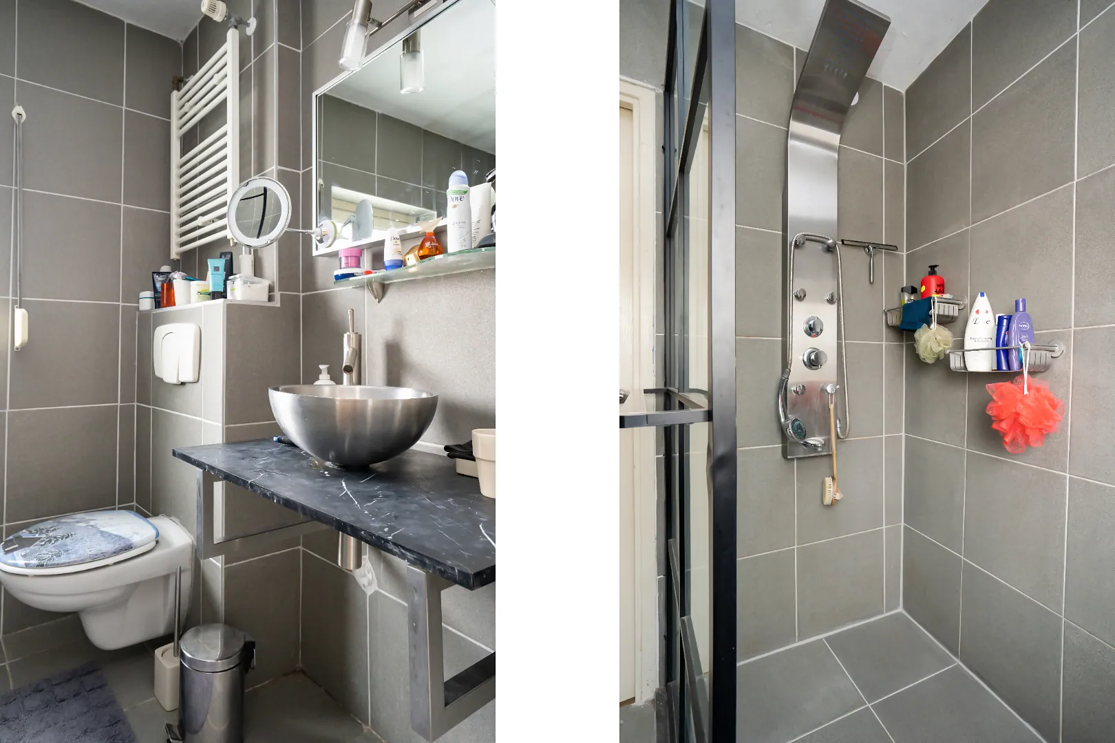 Badkamer voorzien van inloopdouche, wastafel en een zwevend toilet.