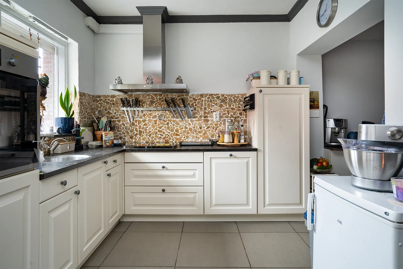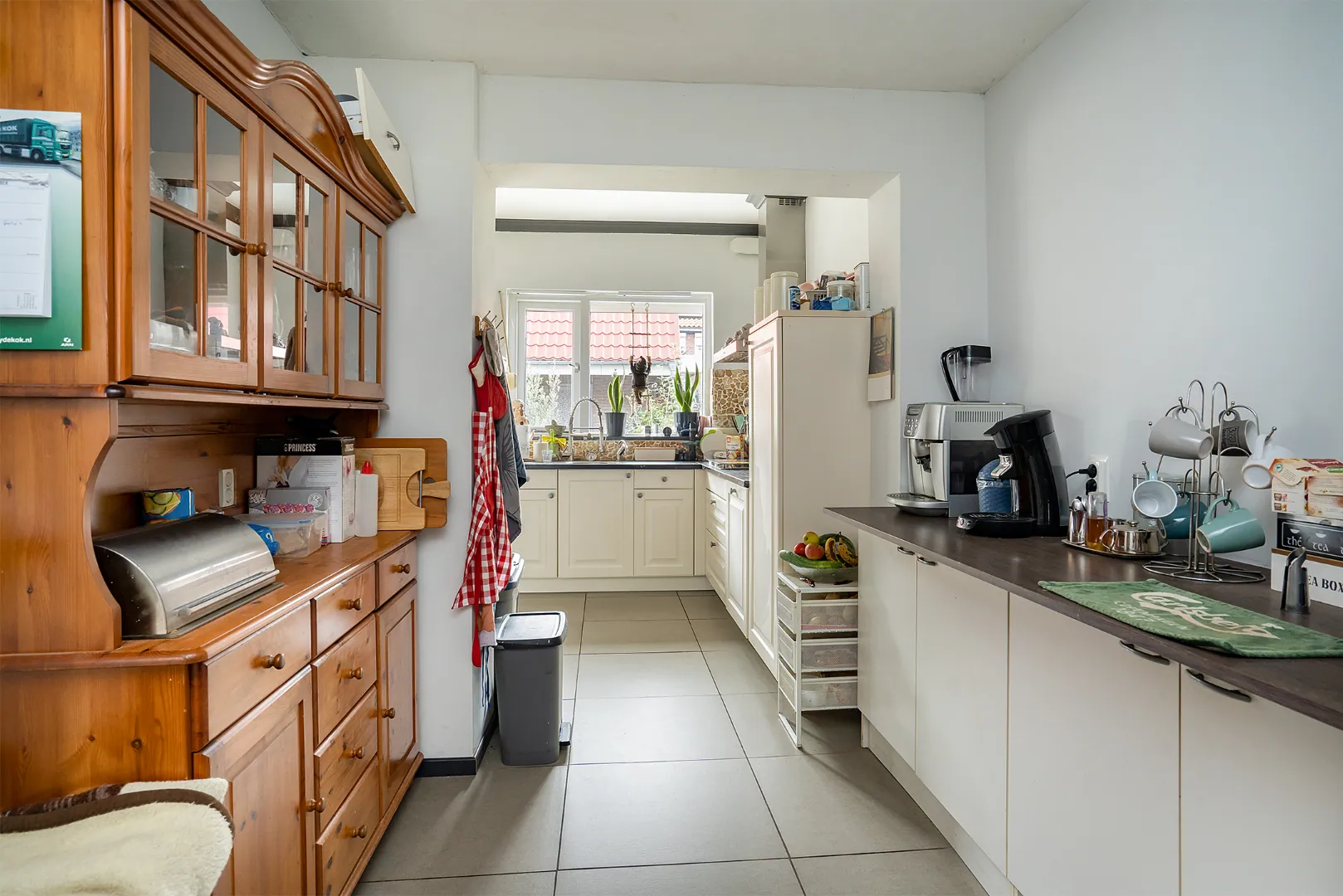 Uitgebouwde, lichte woonkamer met een open keuken voorzien van inbouwapparatuur tevens een lichte tegelvoer met vloerverwarming.