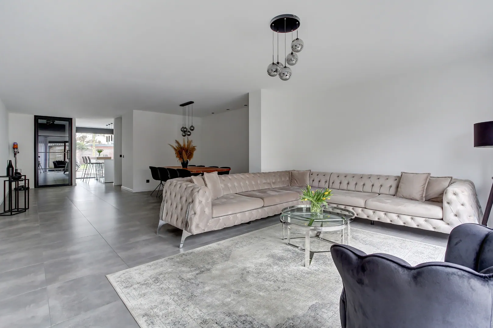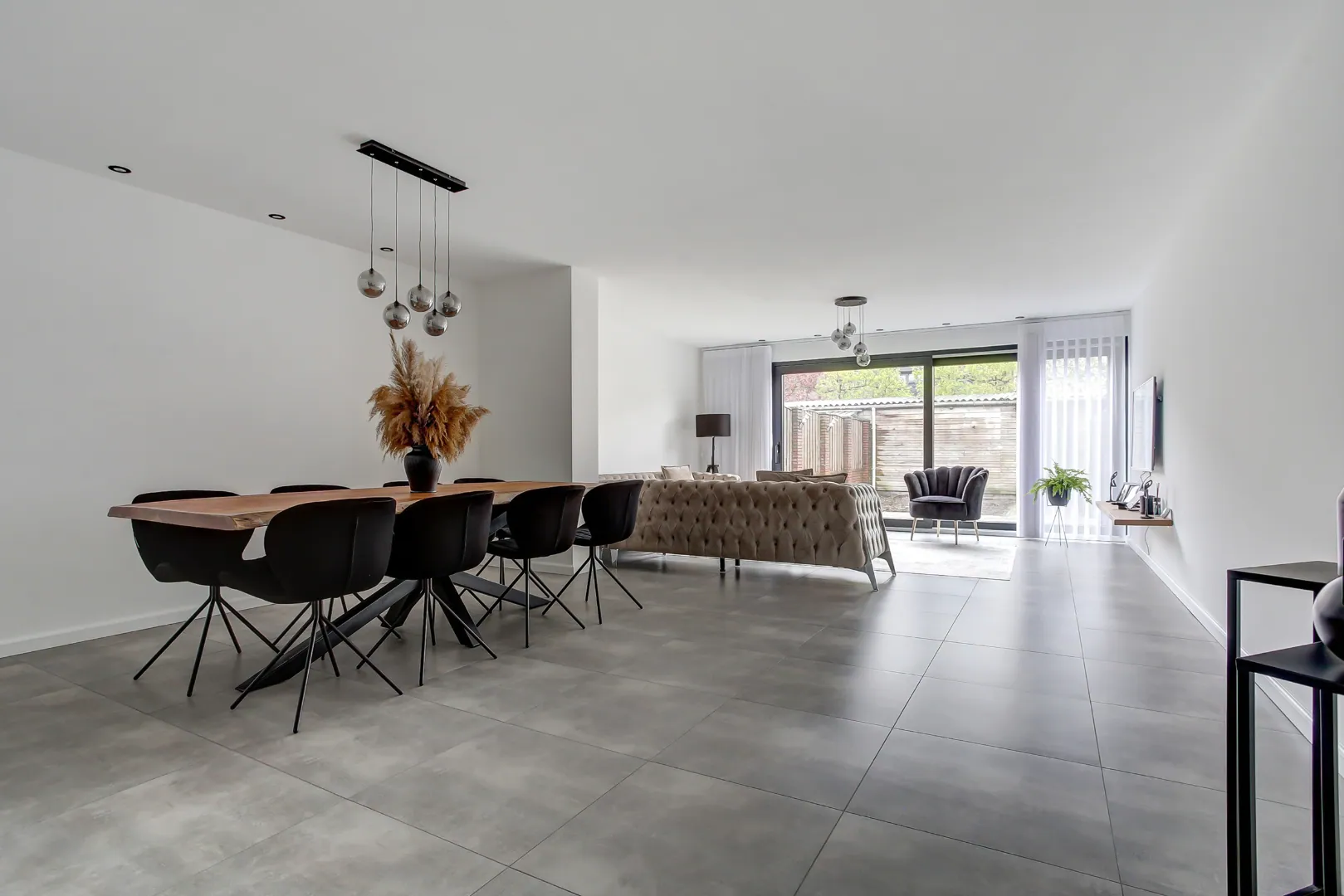 Uitgebouwde woonkamer (totale lengte van voor naar achter ruim 13,5 meter!) met tegelvloer en vloerverwarming, trapkast en een schuifpui van bijna 4 meter!