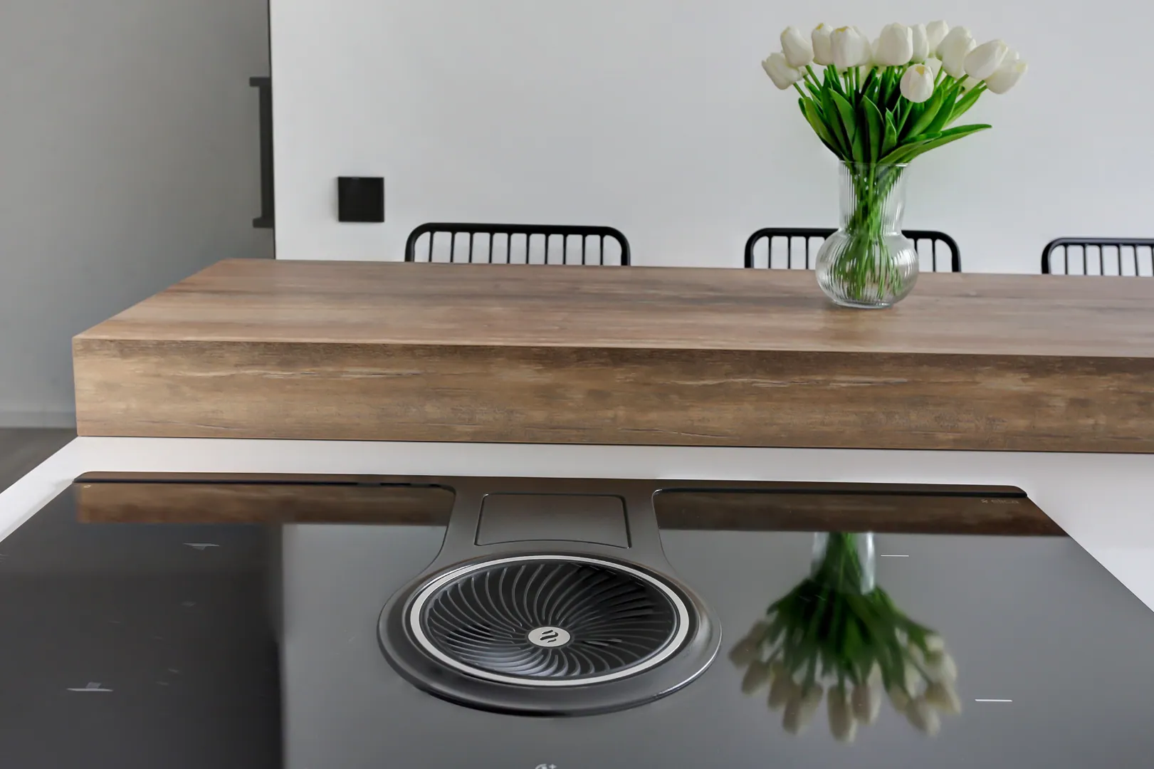 Aan de voorzijde is de keuken gelegen, voorzien van een zeer fraaie inrichting met kookeiland, met o.a. een inductiekookplaat met geïntegreerde afzuiging, oven, vaatwasser en koelkast (1.78m. hoogte).