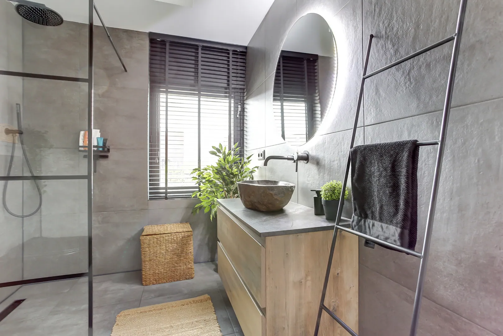 Zeer fraaie badkamer voorzien van brede inloopdouche (ca. 1, 25 m.), zwevend toilet en ruim, modern wastafelmeubel.