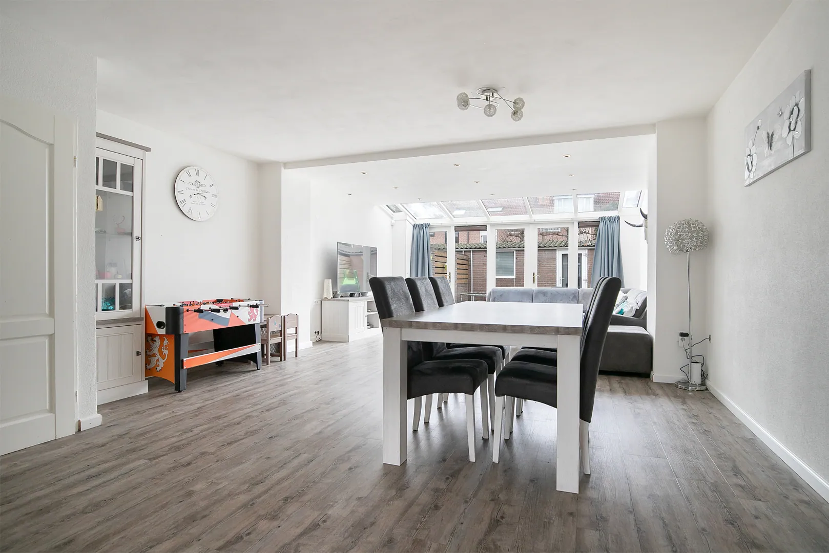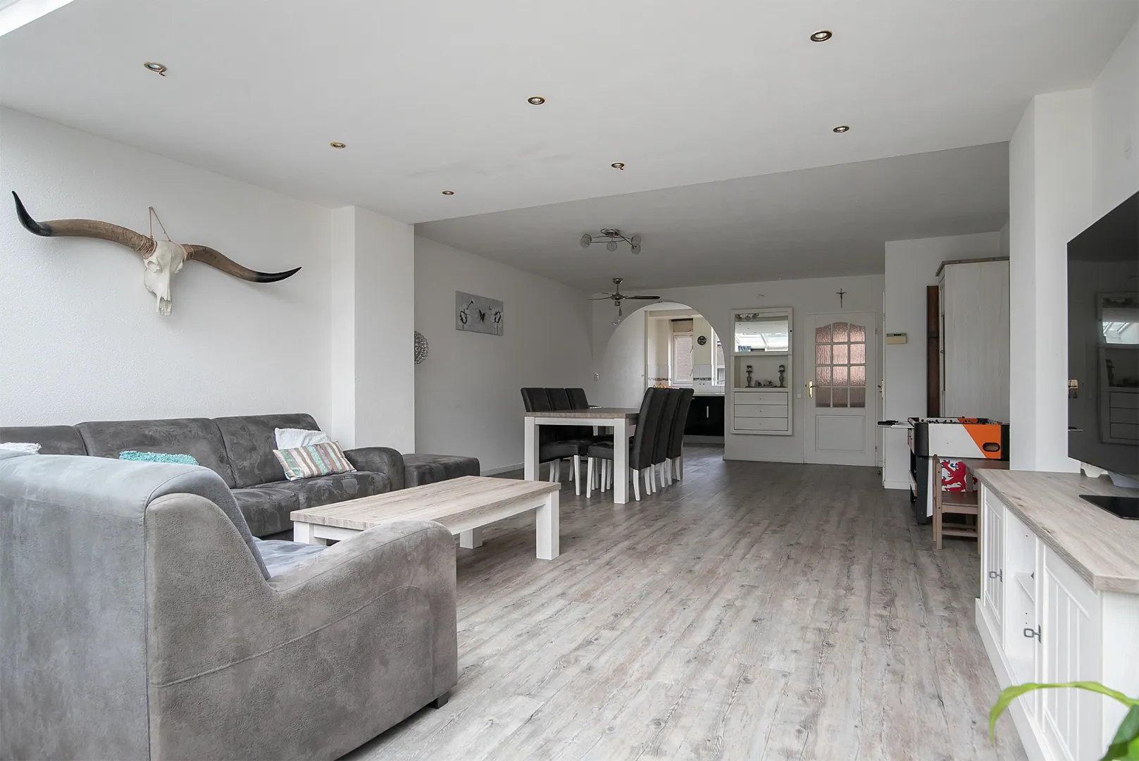 Hal, toilet, trapopgang en toegang tot de zeer ruime, uitgebouwde, woonkamer geheel voorzien van een fraaie pvc-vloer. Aan de voorzijde bevindt zich de keuken, opgesteld in hoekopstelling en voorzien van inbouwapparatuur zoals een vaatwasser, inductiekookplaat, afzuigkap, combimagnetron en koelkast. De aanbouw (van ca. 4 meter!) geeft vanwege de raampartijen zeer veel lichtinval, om de zoninval te beperken is er een elektrisch zonnescherm aanwezig.