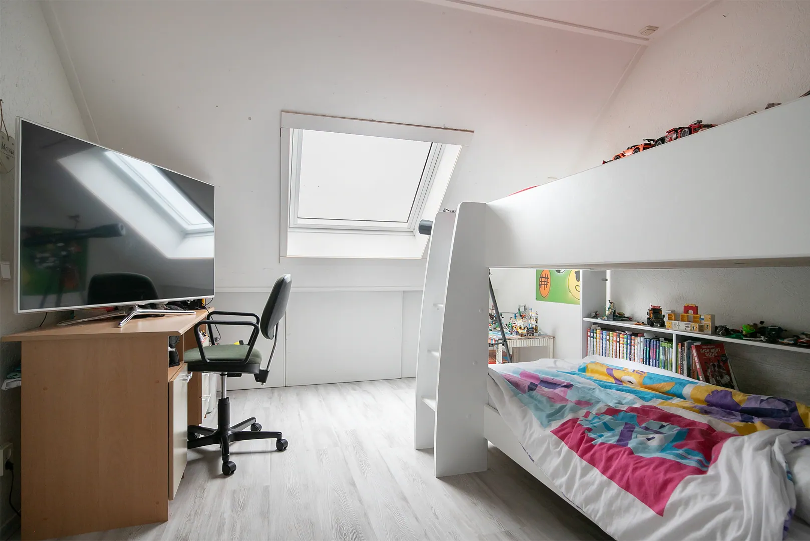 Tevens is op deze verdieping de derde , eveneens ruime en lichte, slaapkamer aanwezig.
