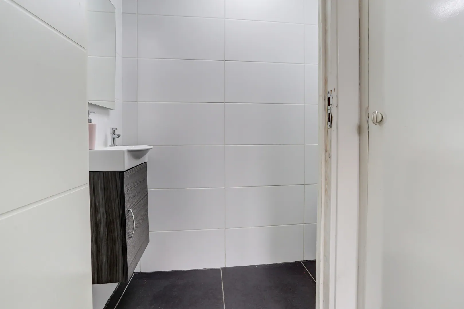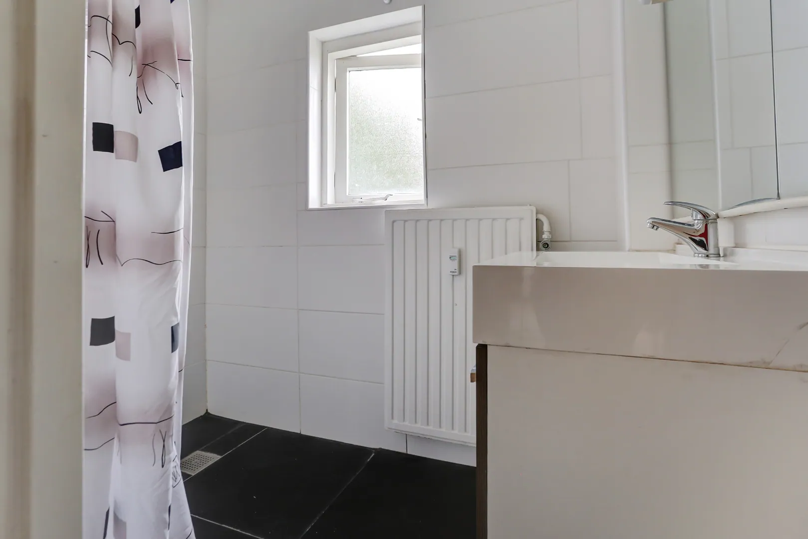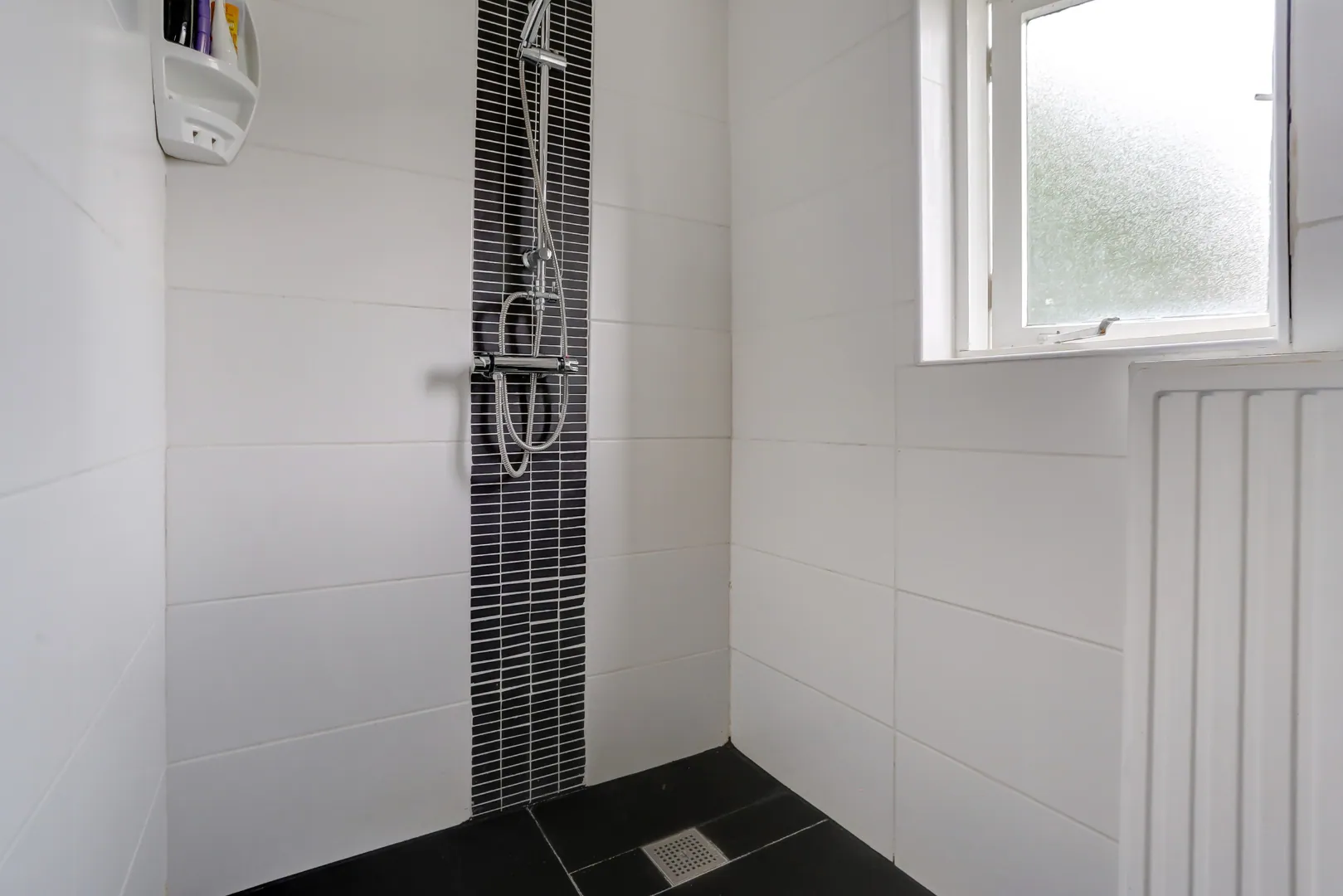 Overloop, 3 goede, lichte slaapkamers met laminaatvloer en modern betegelde badkamer bestaande uit een wastafelmeubel en douche.