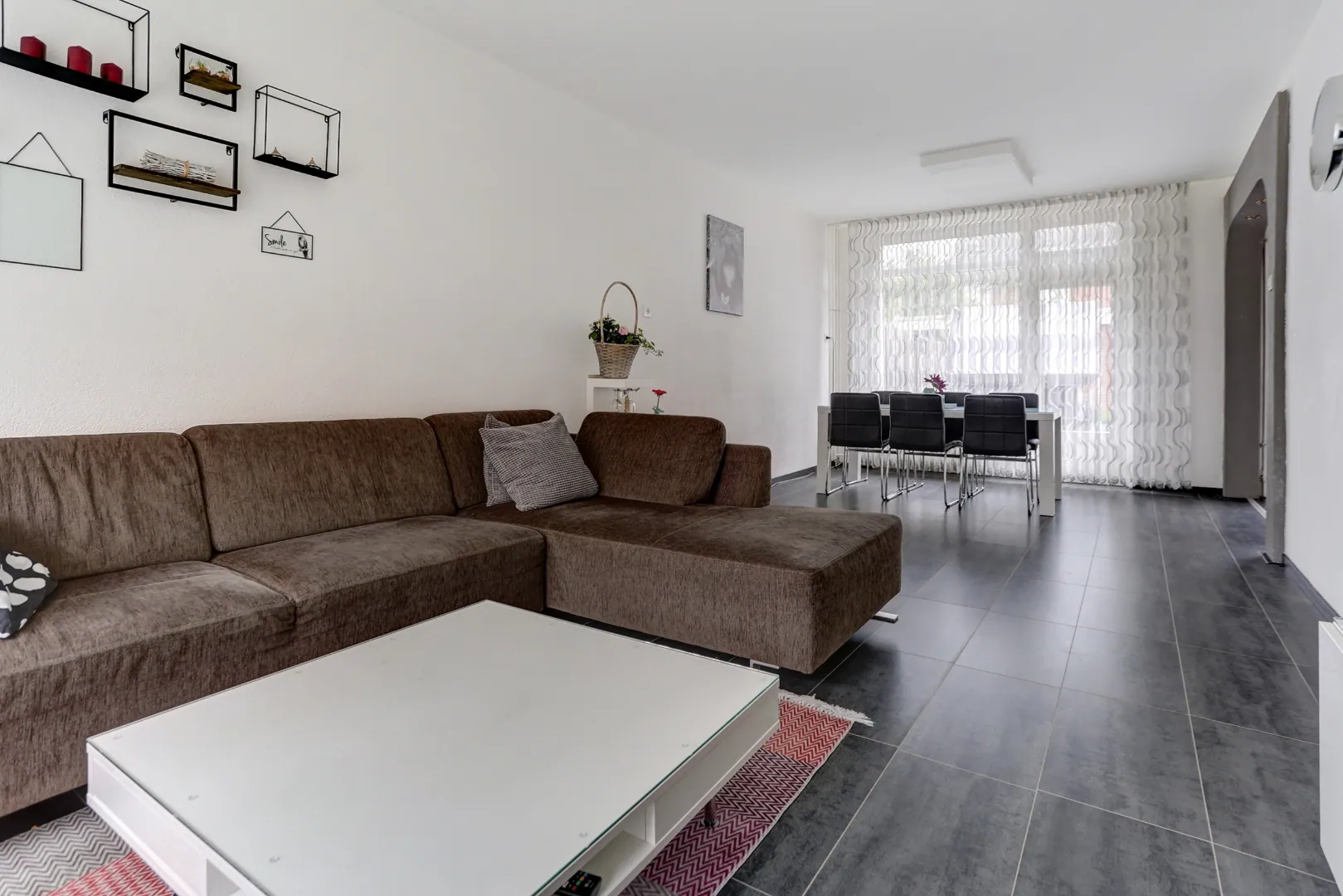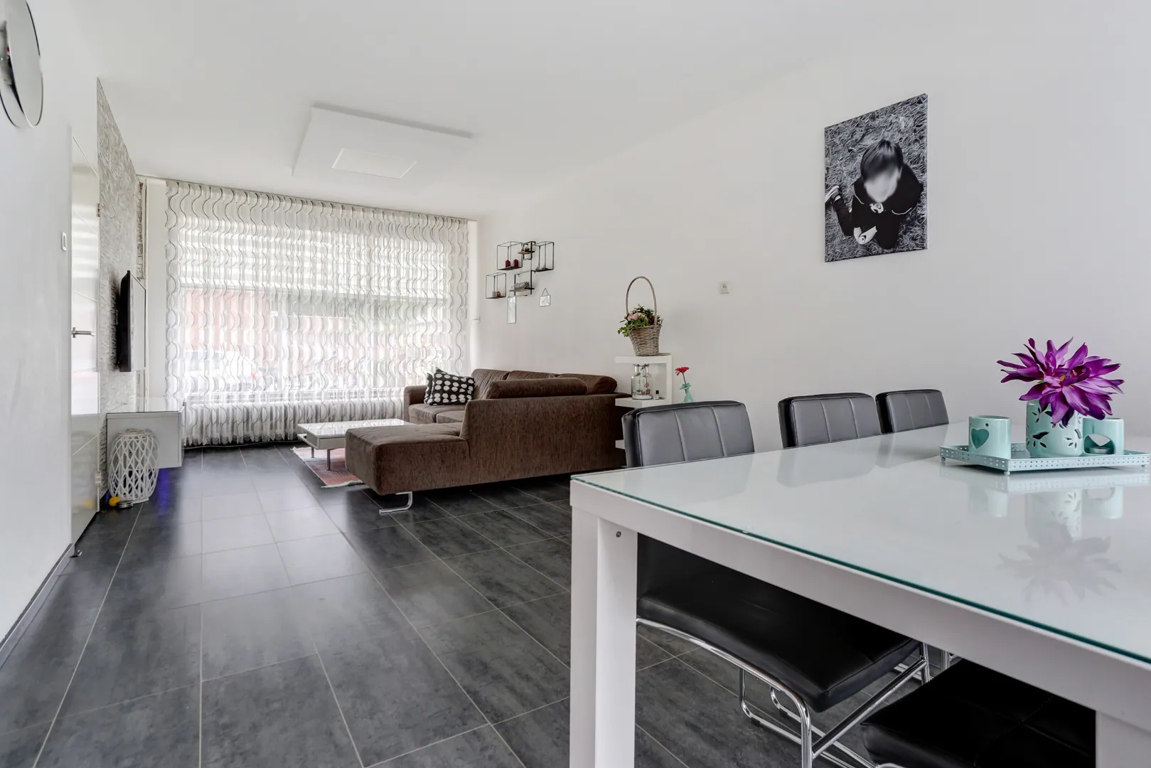 Entree/hal met meterkast, trapopgang, modern toilet en toegang tot de woonkamer. Lichte woonkamer, type doorzon, met tegellaminaatvloer en toegang tot de open keuken met moderne hoekinrichting voorzien van diverse inbouwapparatuur.