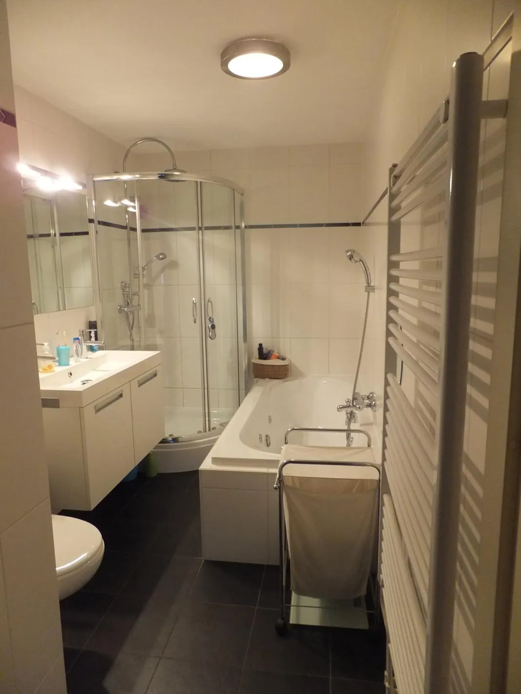1e verdieping: ruime overloop, 3 slaapkamers voorzien van laminaatvloer en inbouwkasten. Zeer fraaie, luxe badkamer voorzien met vloerverwarming van whirlpool, douchecabine met regendouche, zwevend toilet, wandmeubel met wastafel en designradiator.