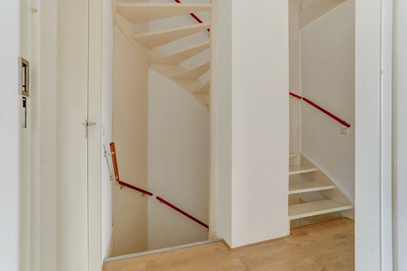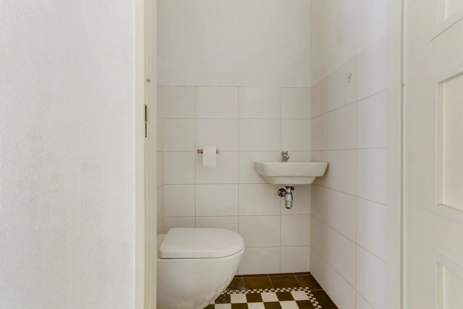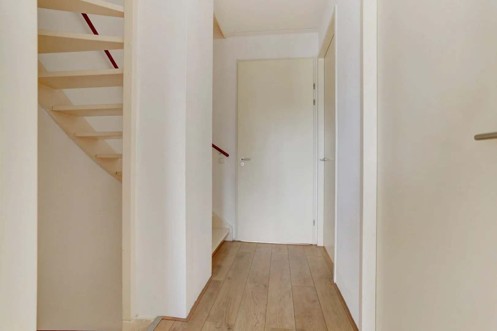Entree/hal met meterkast, trapopgang, voorzien van tegelvloer en toegang tot moderne toiletruimte, welke is voorzien van zwevend toilet en fontein.
