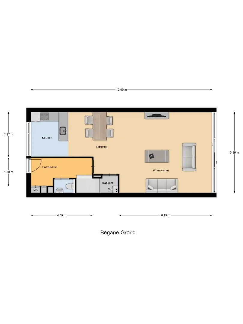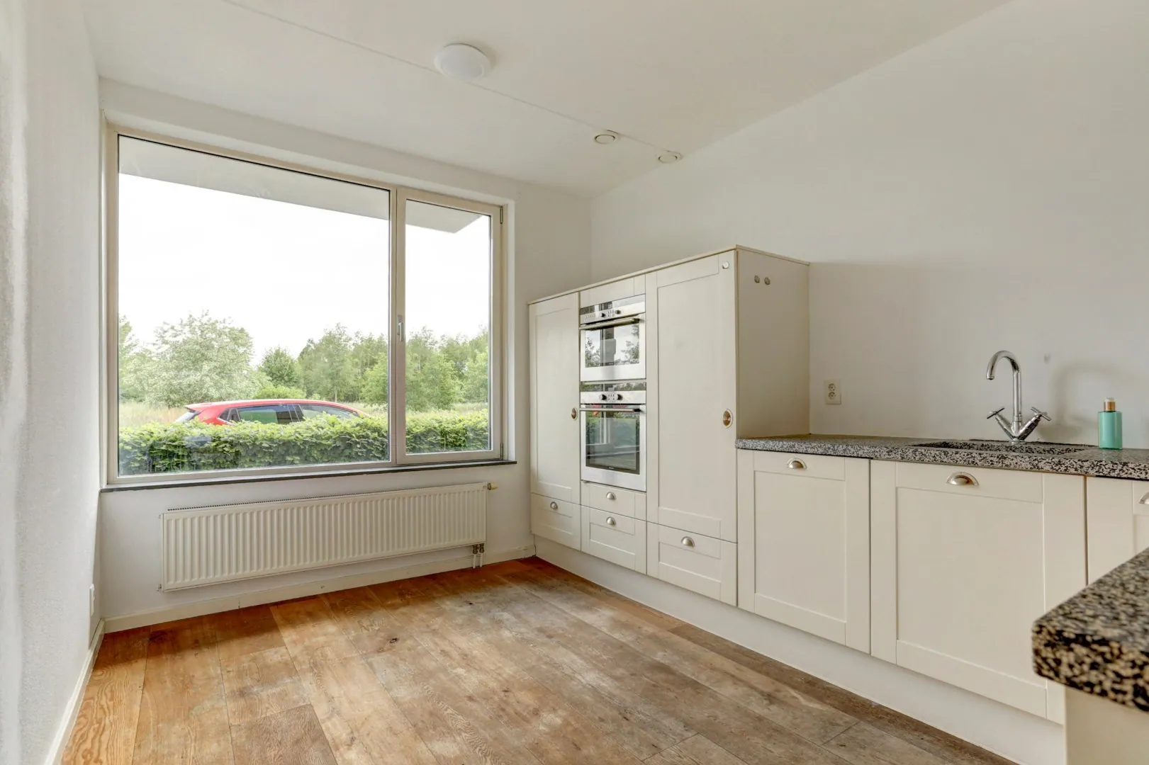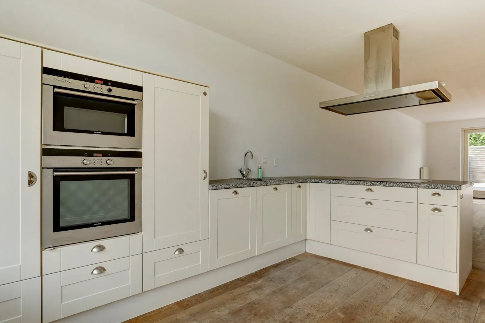 Moderne keuken in hoekopstelling en voorzien van terrazzo aanrechtblad, inductie kookplaat, rvs afzuigkap, koelkast, heteluchtoven, combi-magnetron en vaatwasser (allen Siemens). Vanuit de keuken is er vrij uitzicht aan de voorzijde.