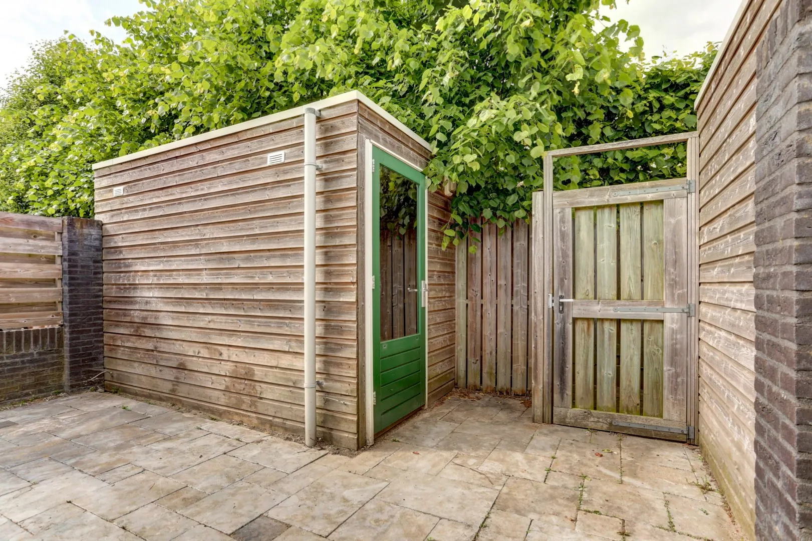 Onderhoudsarme achtertuin volledig voorzien van sierbestrating. Verder is er een vrijstaande houten berging aanwezig, voorzien van elektra.