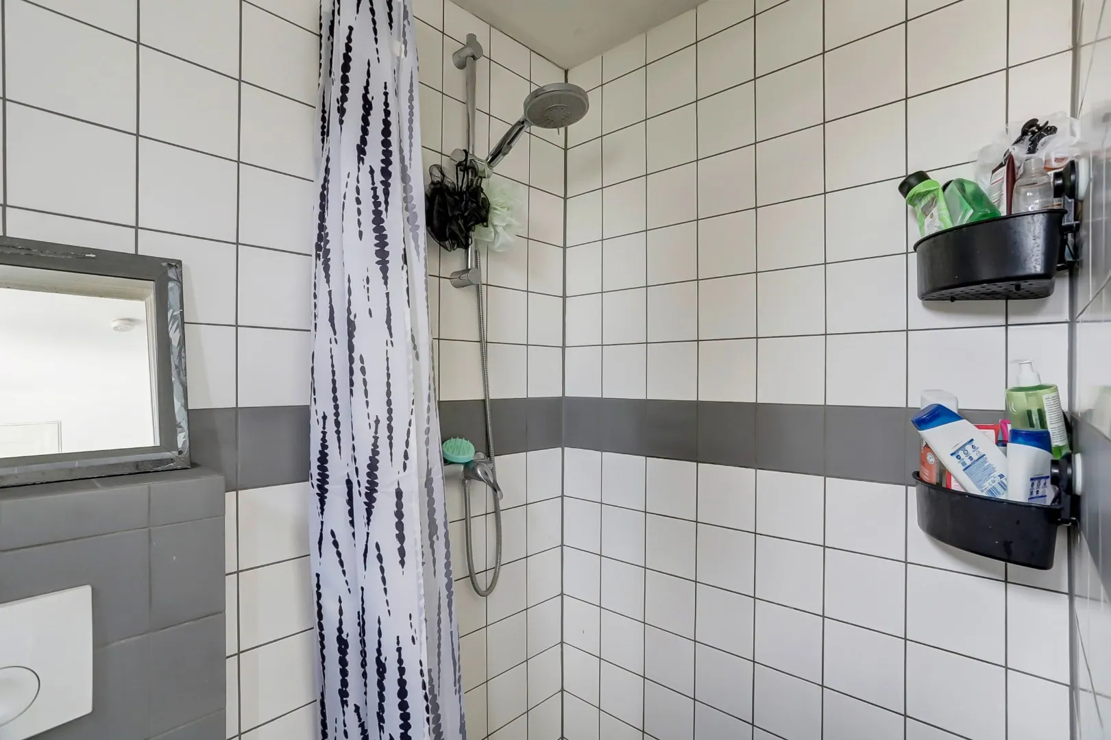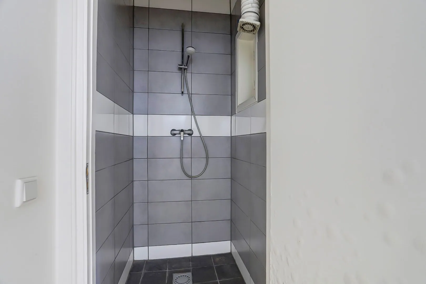 Badkamer met douche en toilet.