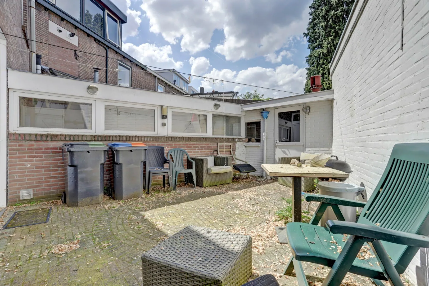 De achtertuin bestaat uit een volledig betegelde plaats.