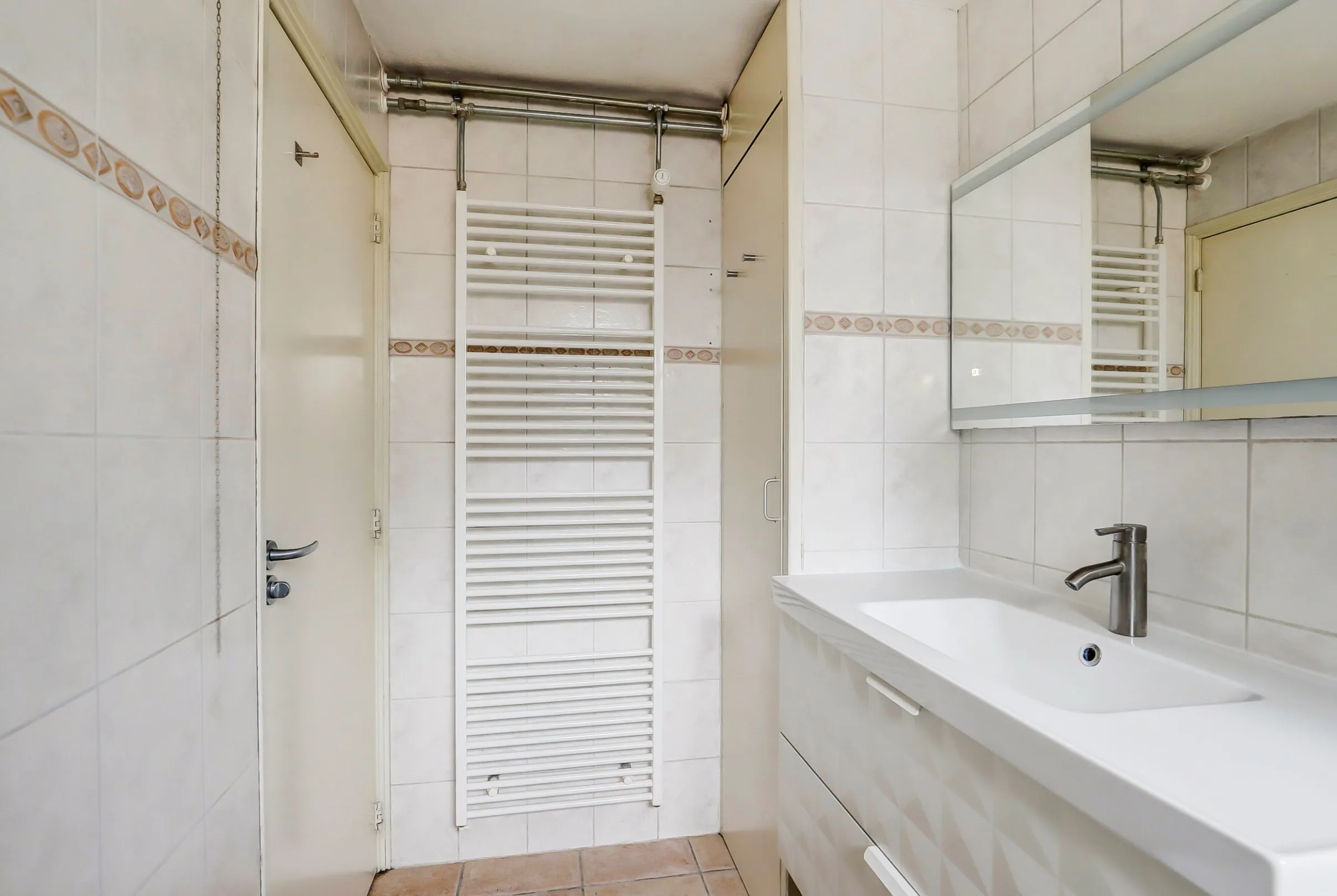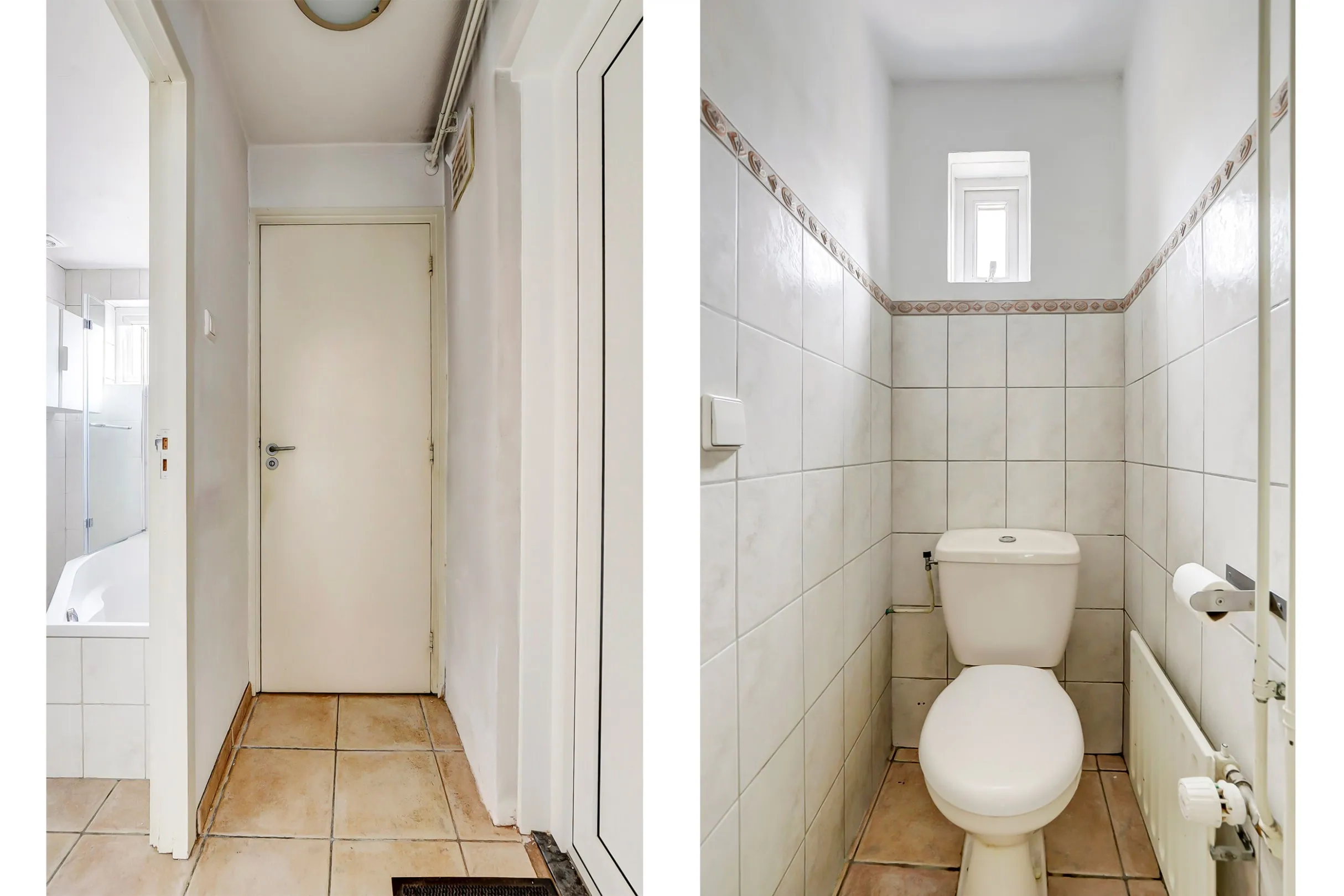 Via de keuken bereik je een halletje met het toilet, de badkamer en tuindeur. De badkamer is voorzien van een donkere tegelvloer en witte wandtegels met sierrand. De badkamer heeft een breed wastafelmeubel, ligbad met douchemogelijkheid en een klepraam.