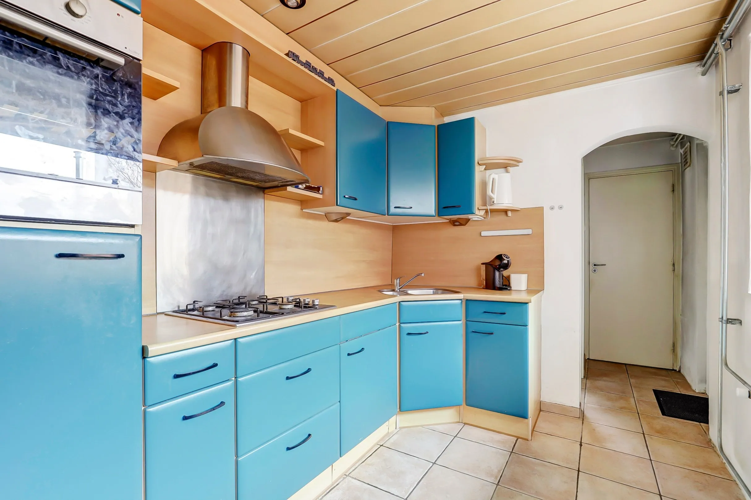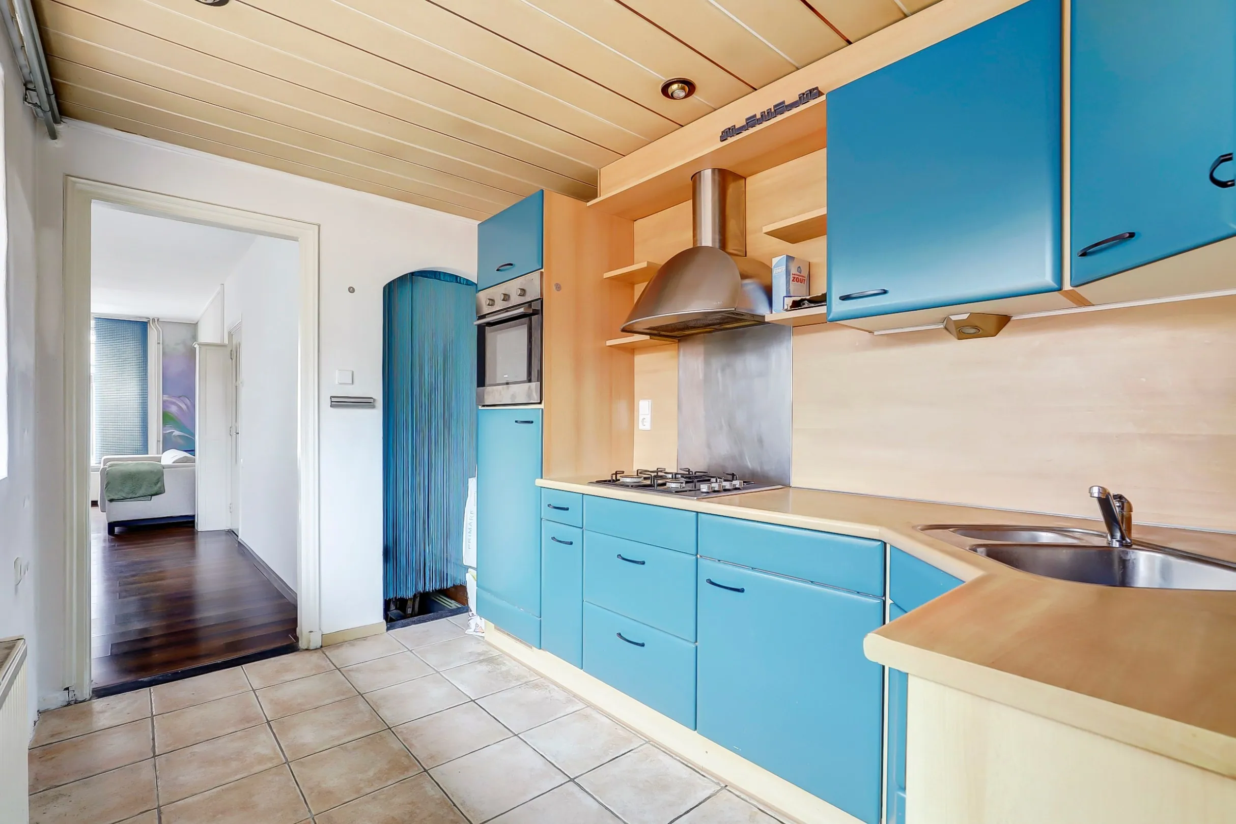 De gesloten keuken bevindt zich aan de achterzijde. Hier beschik je over een hoekopstelling en een groot raampartij met veel lichtinval. De keuken biedt genoeg opbergruimte. Ook is er toegang tot een trapkast met extra bergruimte, hierin is ook een aansluiting voor de wasmachine aansluiting is.
