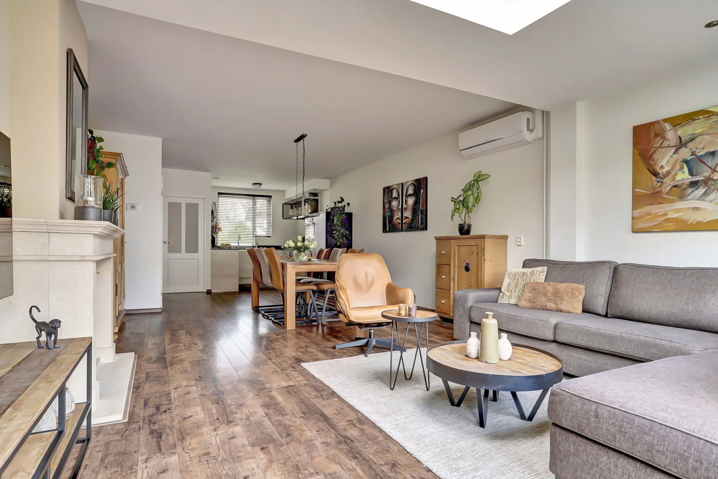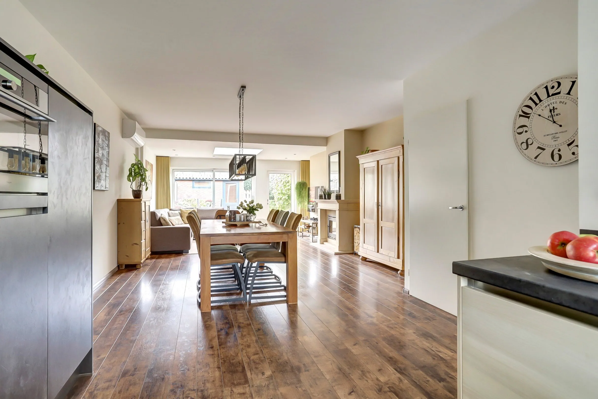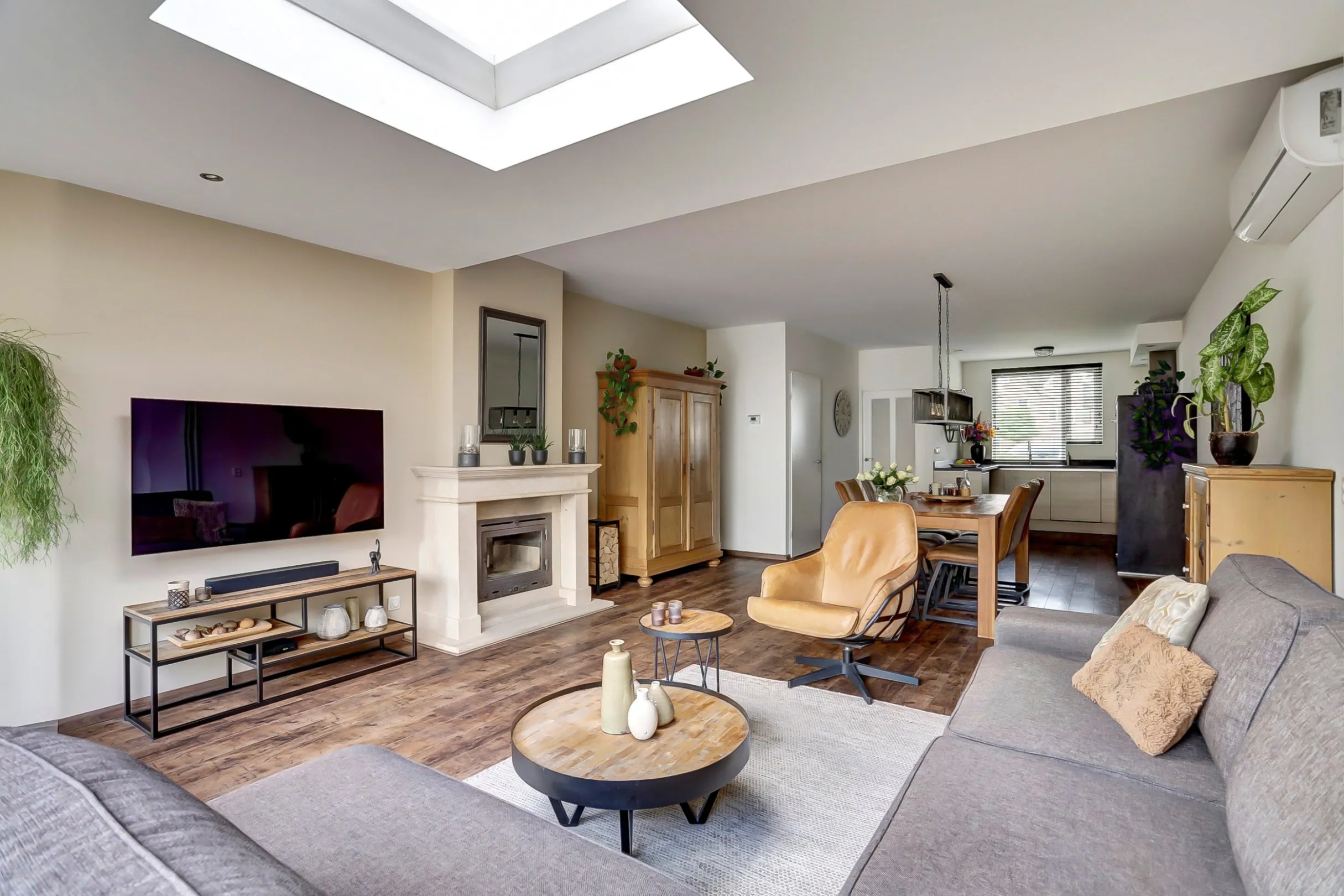 Van hier uit betreed je de ruime, uitgebouwde woonkamer met laminaatvloer en lichtkoepel. Een luxe keuken (U-vorm) voorzien van inductiekookplaat, rvs afzuigkap, combi magnetron, koelkast, vaatwasser en quooker. Voor extra bergruimte is er een functionele trapkast. In het zitgedeelte ziet u een sfeervolle houtkachel, airco, schuifpui en een vaste deur naar buiten.