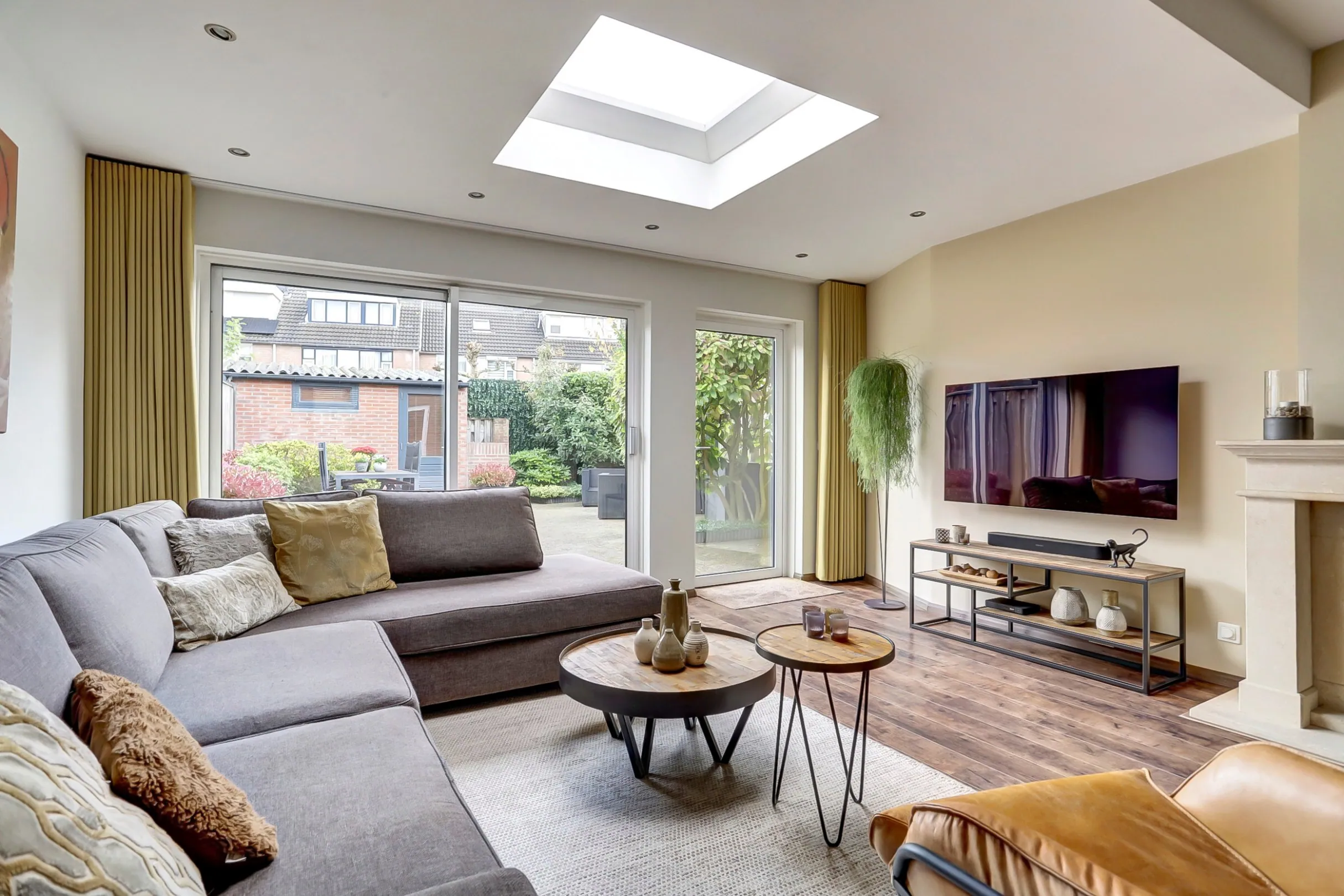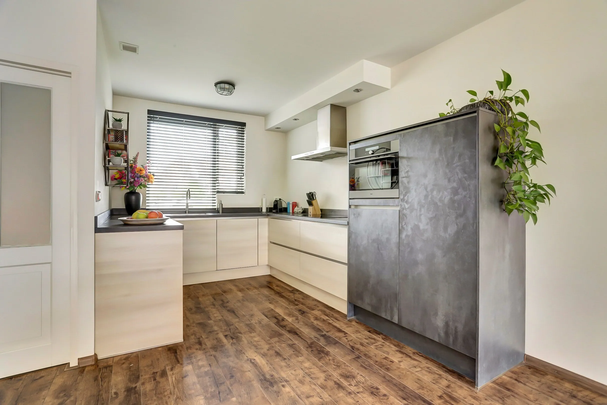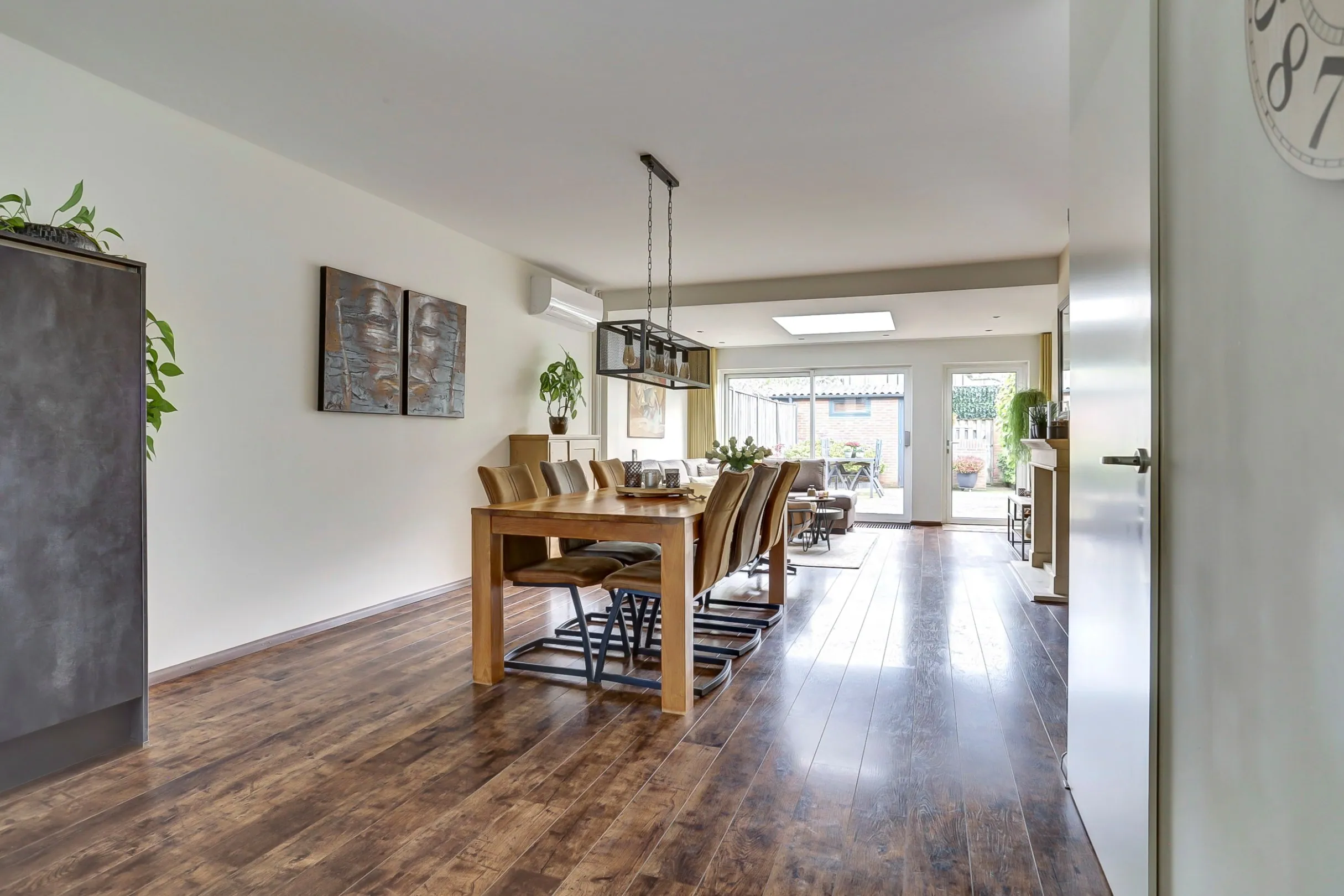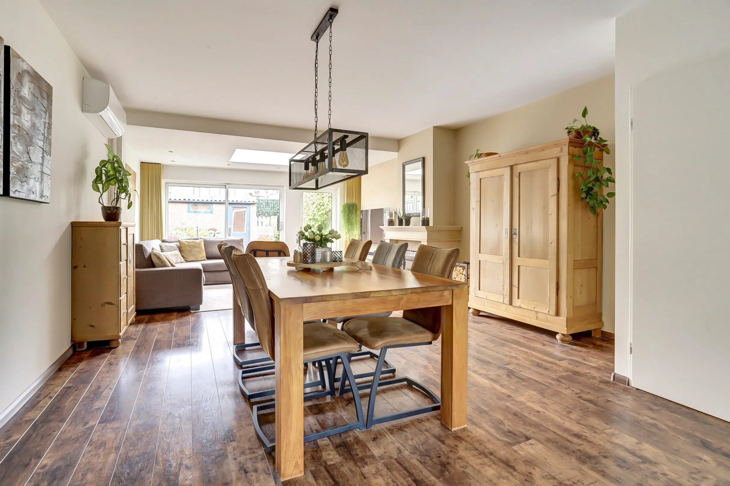 Van hier uit betreed je de ruime, uitgebouwde woonkamer met laminaatvloer en lichtkoepel. Een luxe keuken (U-vorm) voorzien van inductiekookplaat, rvs afzuigkap, combi magnetron, koelkast, vaatwasser en quooker. Voor extra bergruimte is er een functionele trapkast. In het zitgedeelte ziet u een sfeervolle houtkachel, airco, schuifpui en een vaste deur naar buiten.