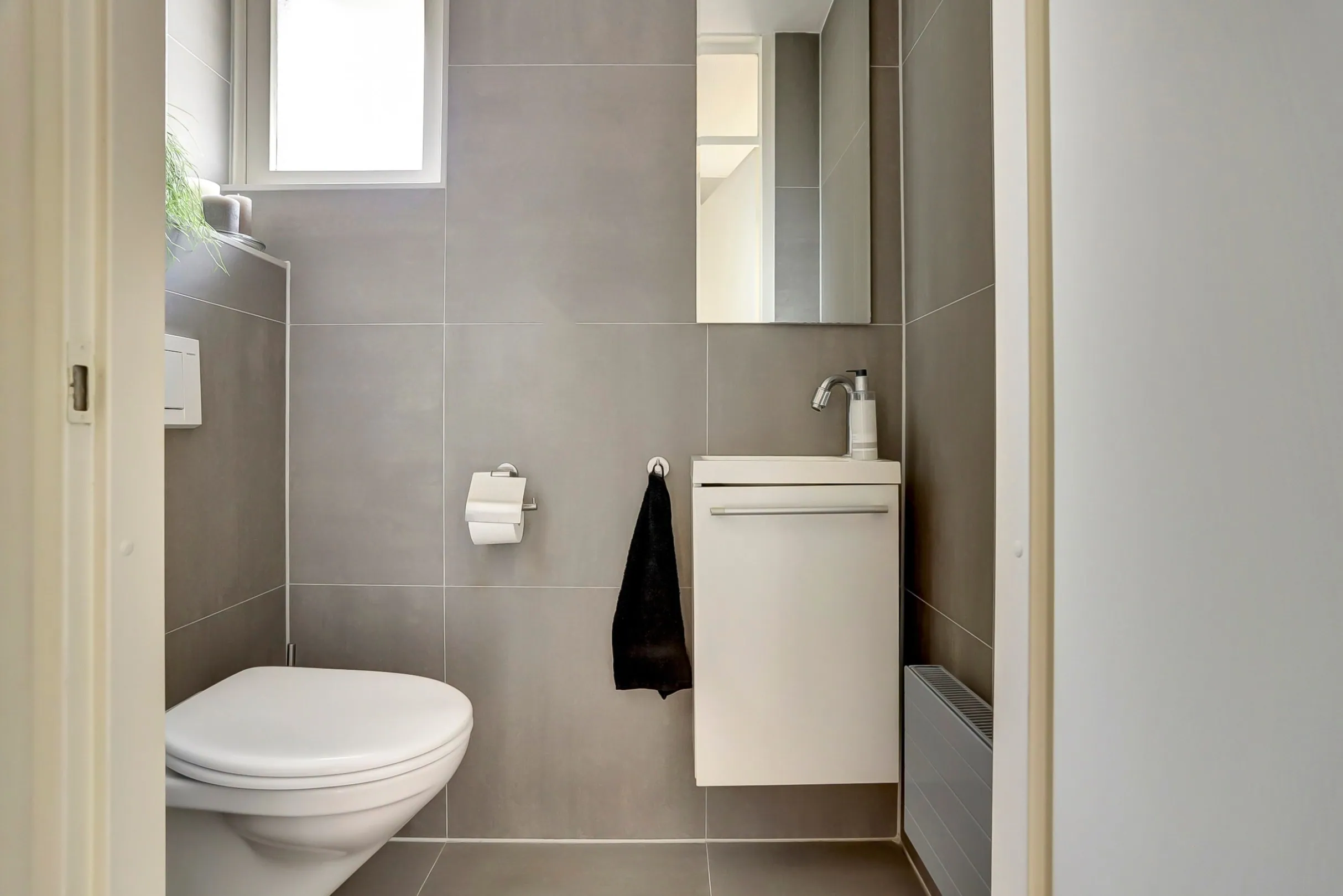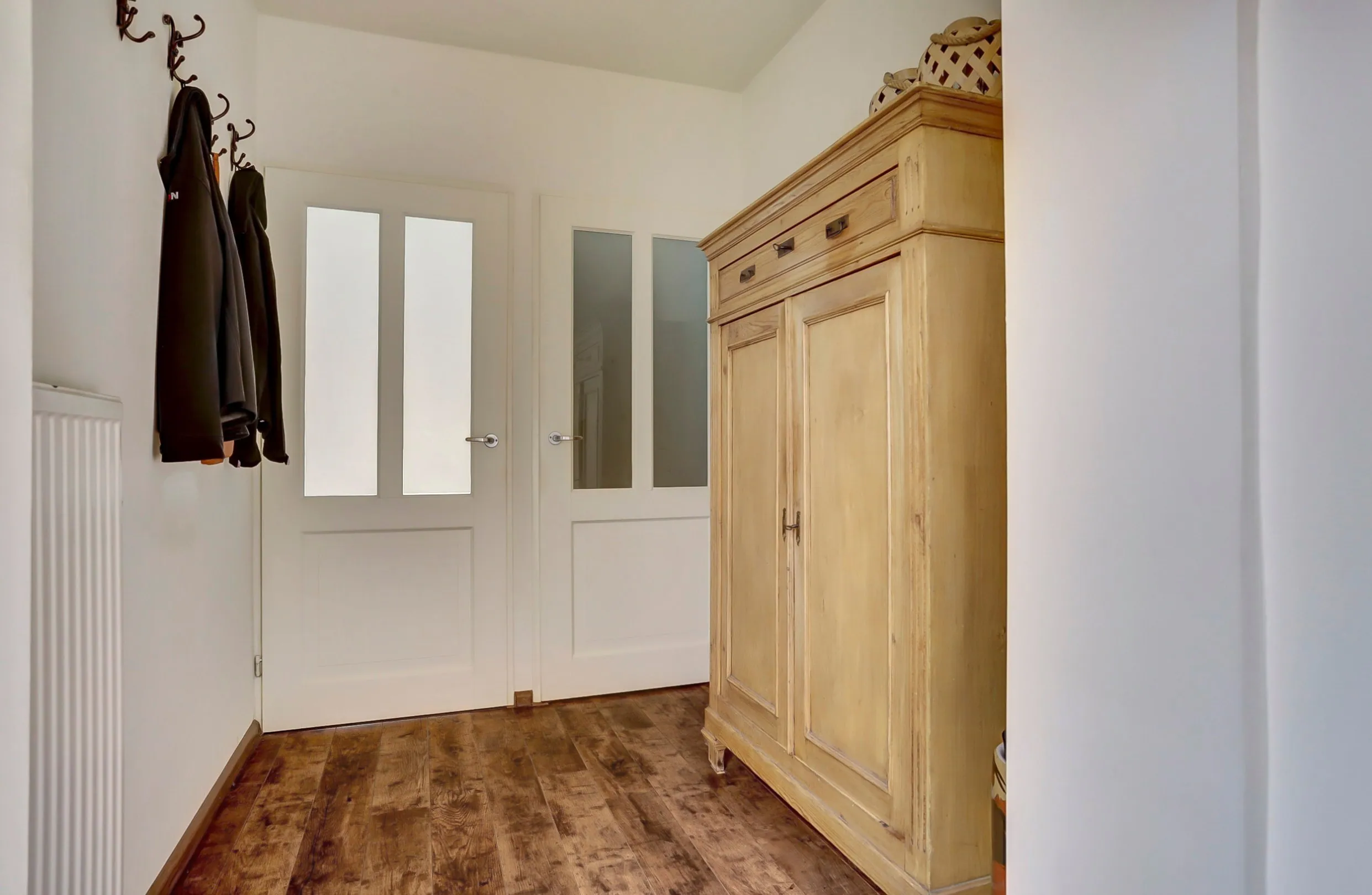 Je komt binnen in een ruime hal waar zich de meterkast, garderobe, toiletruimte met zwevend toilet en fonteintje bevindt.