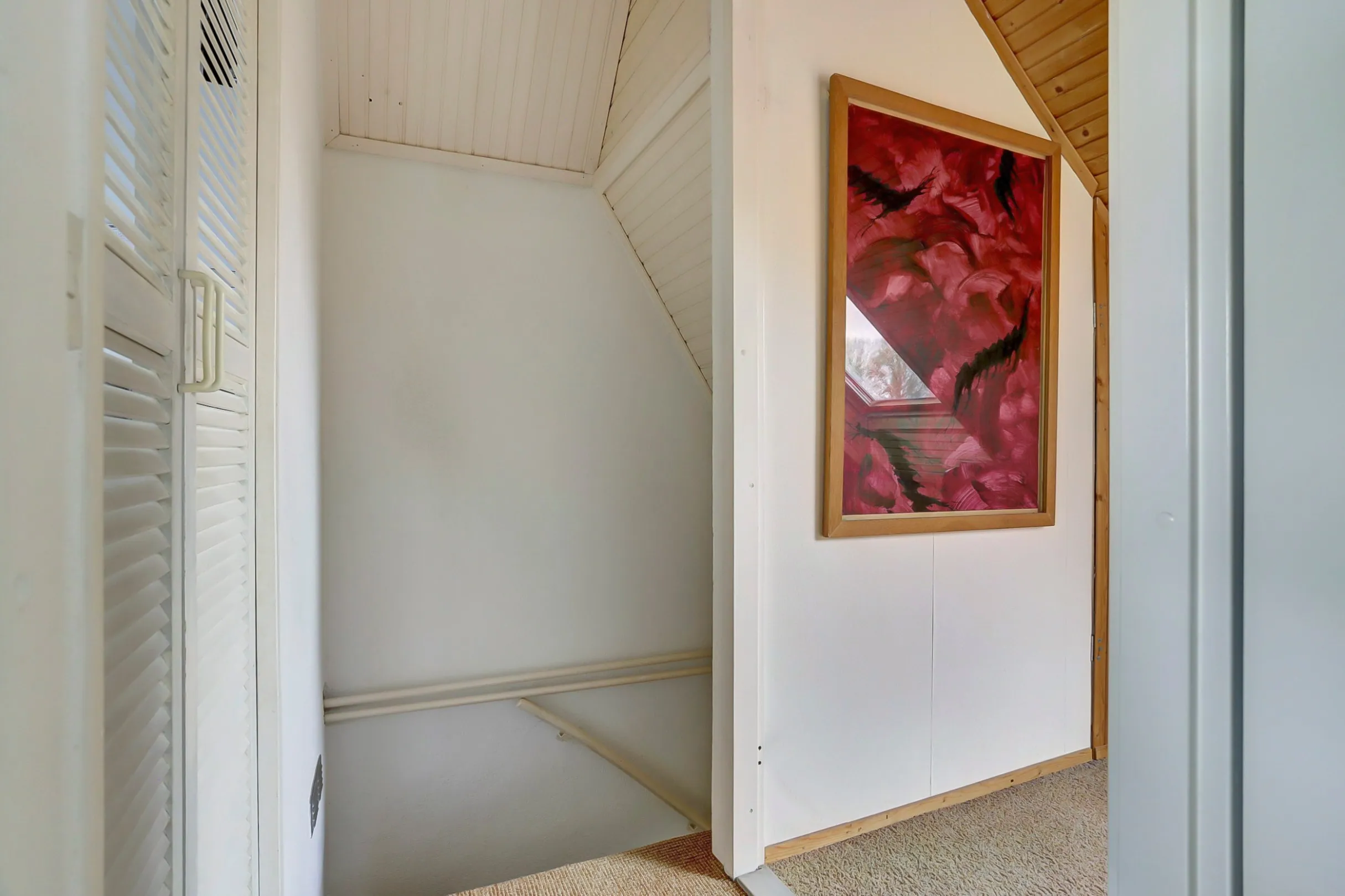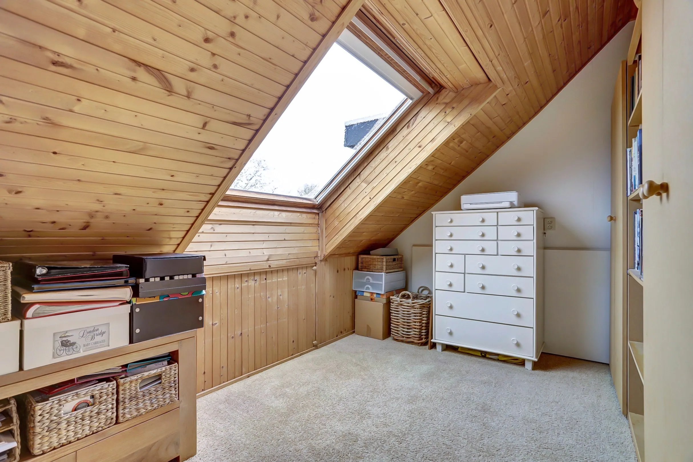 Een overloop met 2 slaapkamers waarvan 1 met dakkapel en vaste wastafel en beiden met veel bergruimtes.